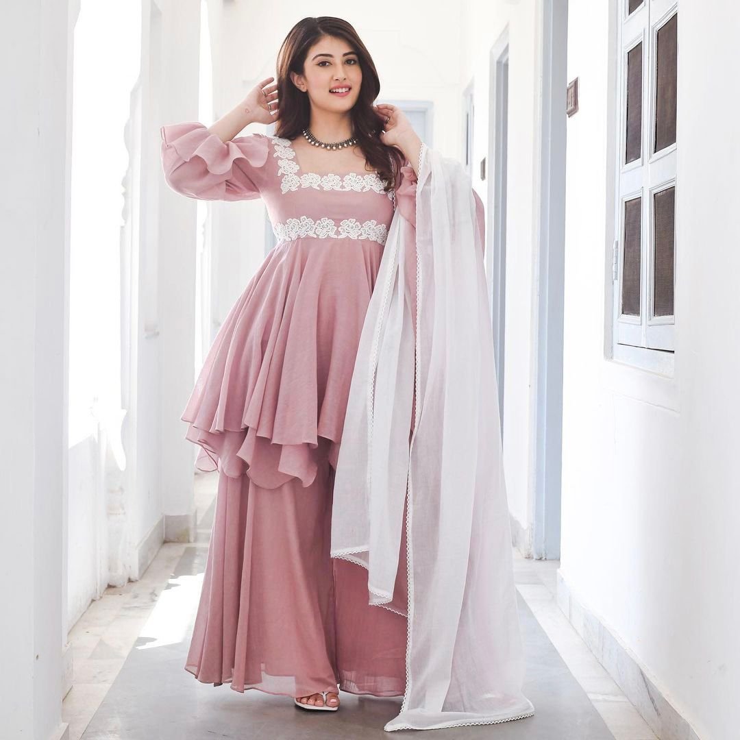 TOP FABRIC :- HEAVY CHINON SILK TOP SIZE :- FULL STITCHED FREE SIZE TOP LENGTH :- 42 INCHED TOP INNER :- MICRO COTTON WORK :- HEAVY CHINE SEQUENCE WORK WITH FANCY SHIKA LACE SLEEVES :- WORK ...