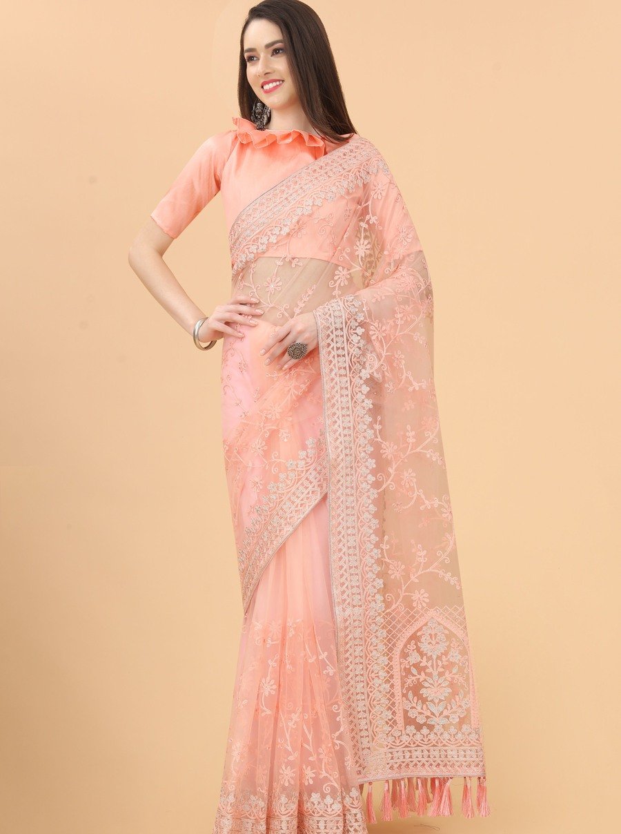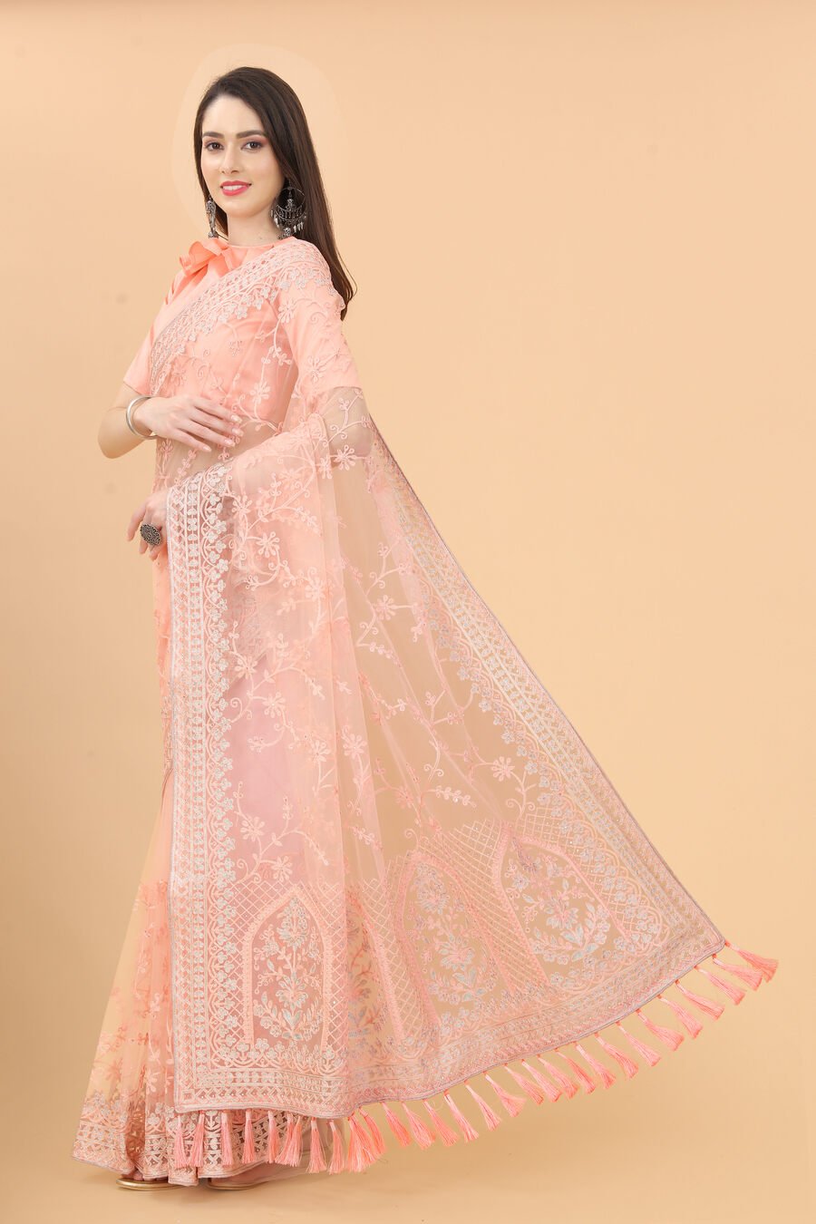 ATTRACTIVE BUTTERFLY NET AARI AND DIAMOND WORK SAREE WITH UNSTITCHED BLOUSE PEACH