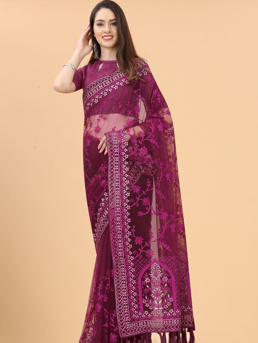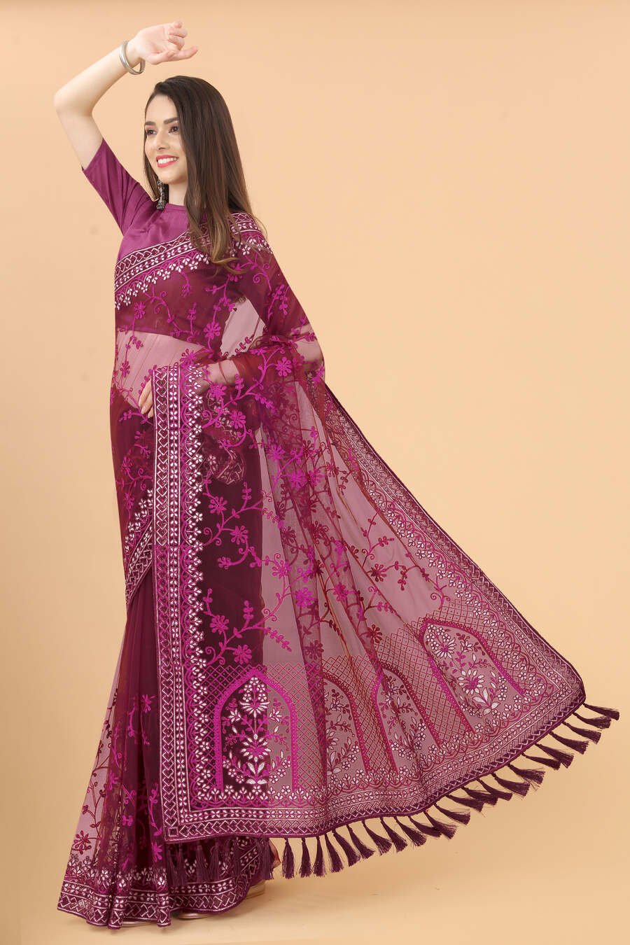 ATTRACTIVE BUTTERFLY NET AARI AND DIAMOND WORK SAREE WITH UNSTITCHED BLOUSE WINE