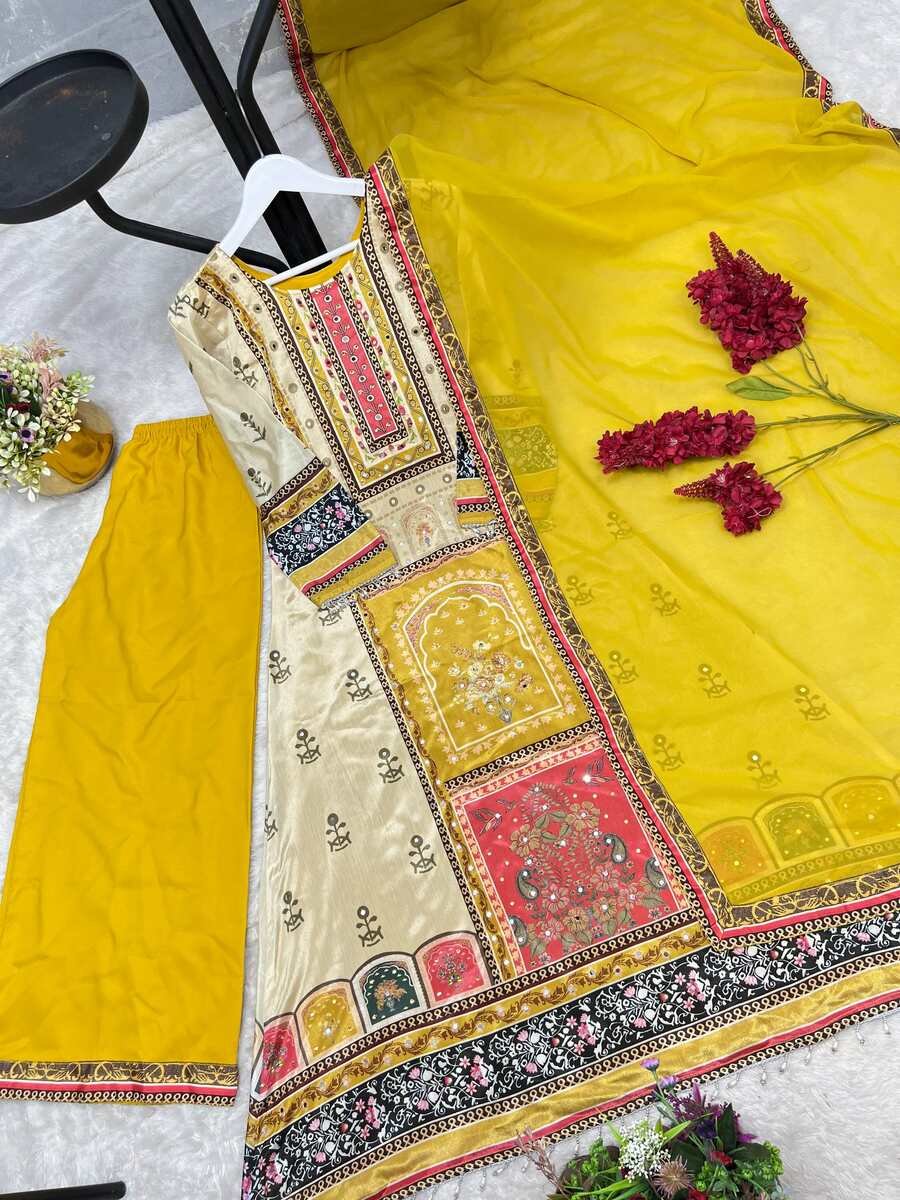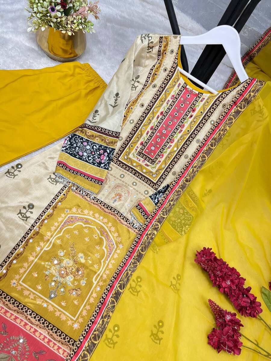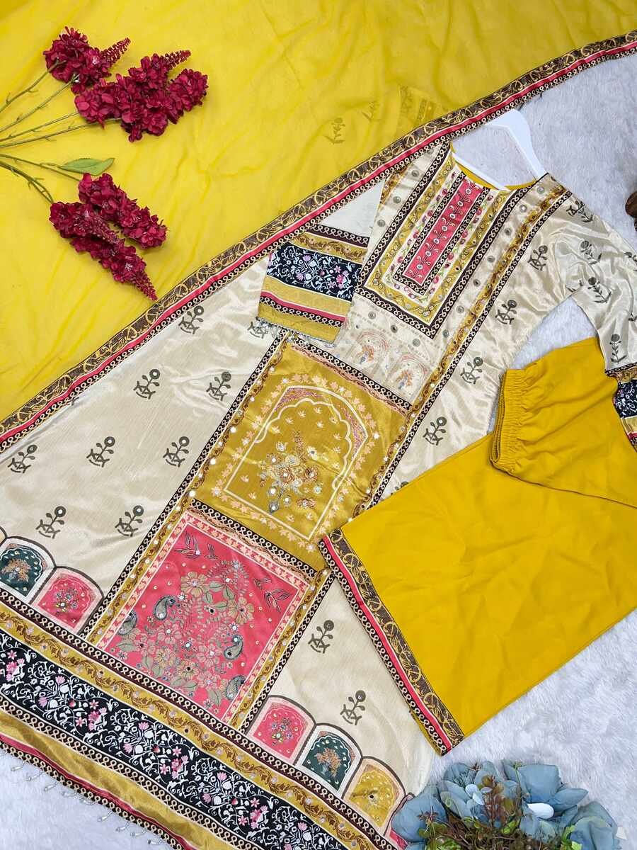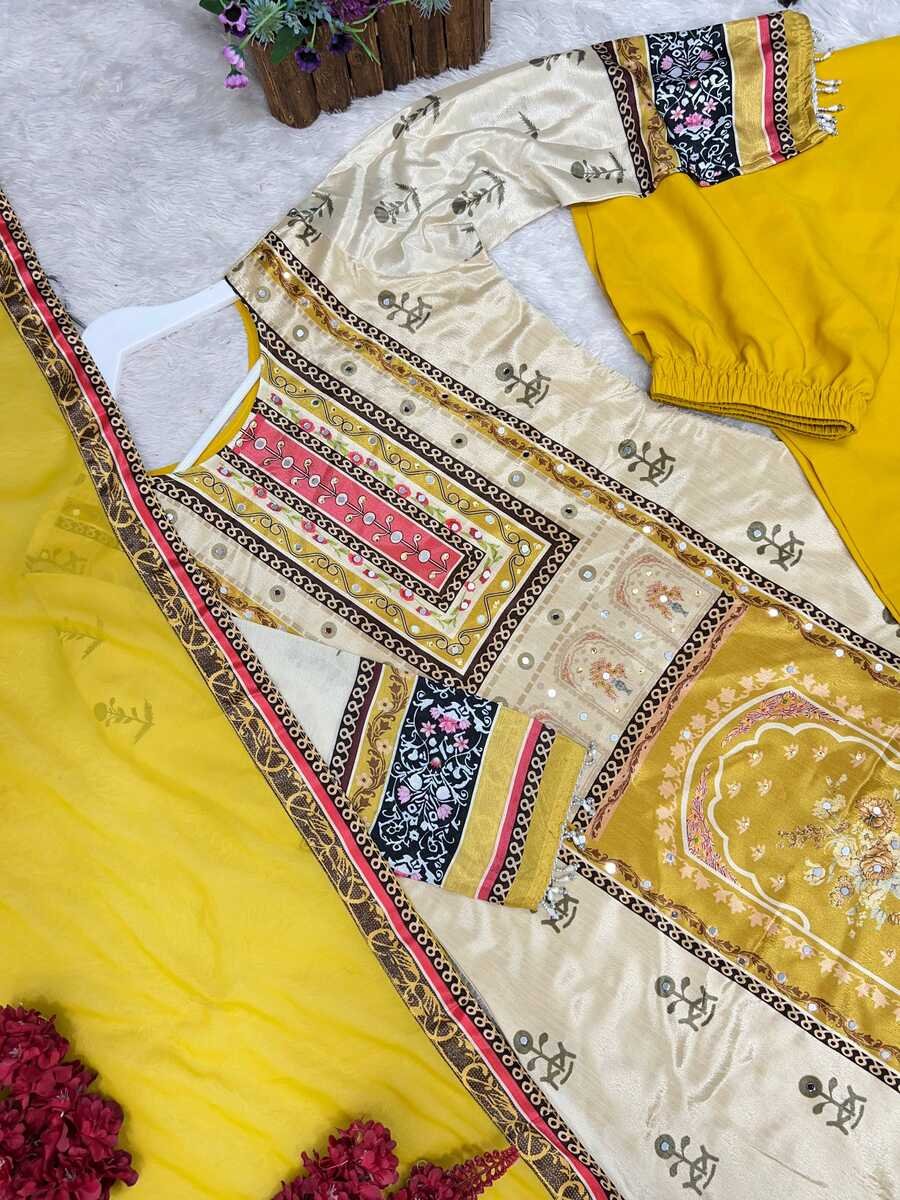 WORK : BEAUTIFUL DIGITAL PRINT WITH REAL MIRROR HAND WORK AND HANGINGS LACE BORDER