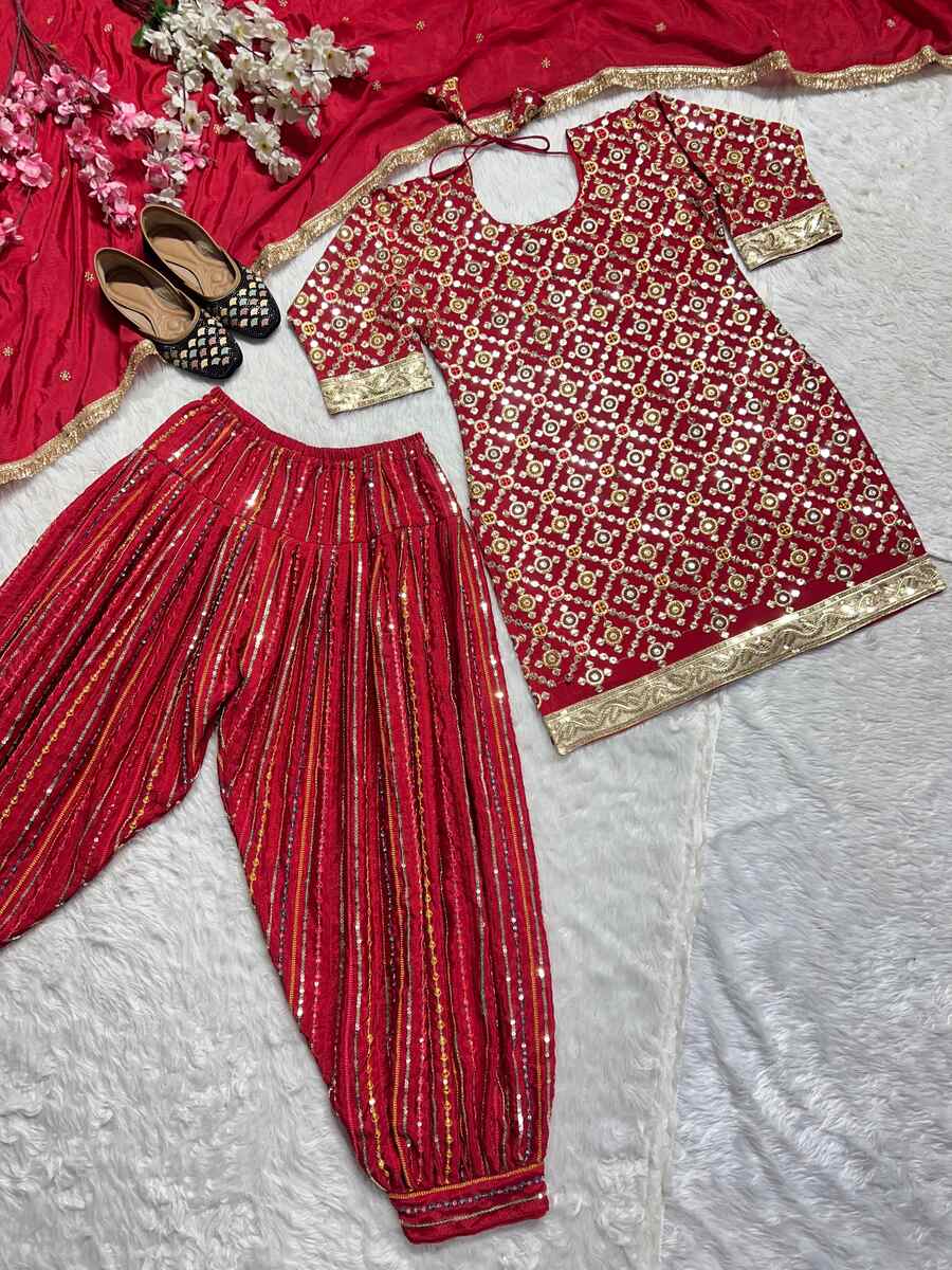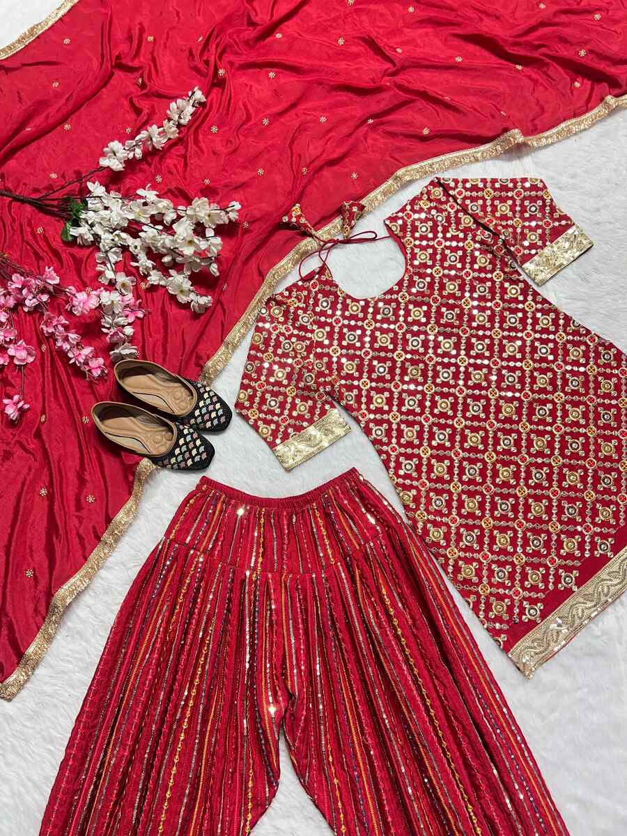 ATTRACTIVE CHINON SILK EMBROIDERY SEQUENCE WORK TOP PATIYA WITH DUPATTA RED