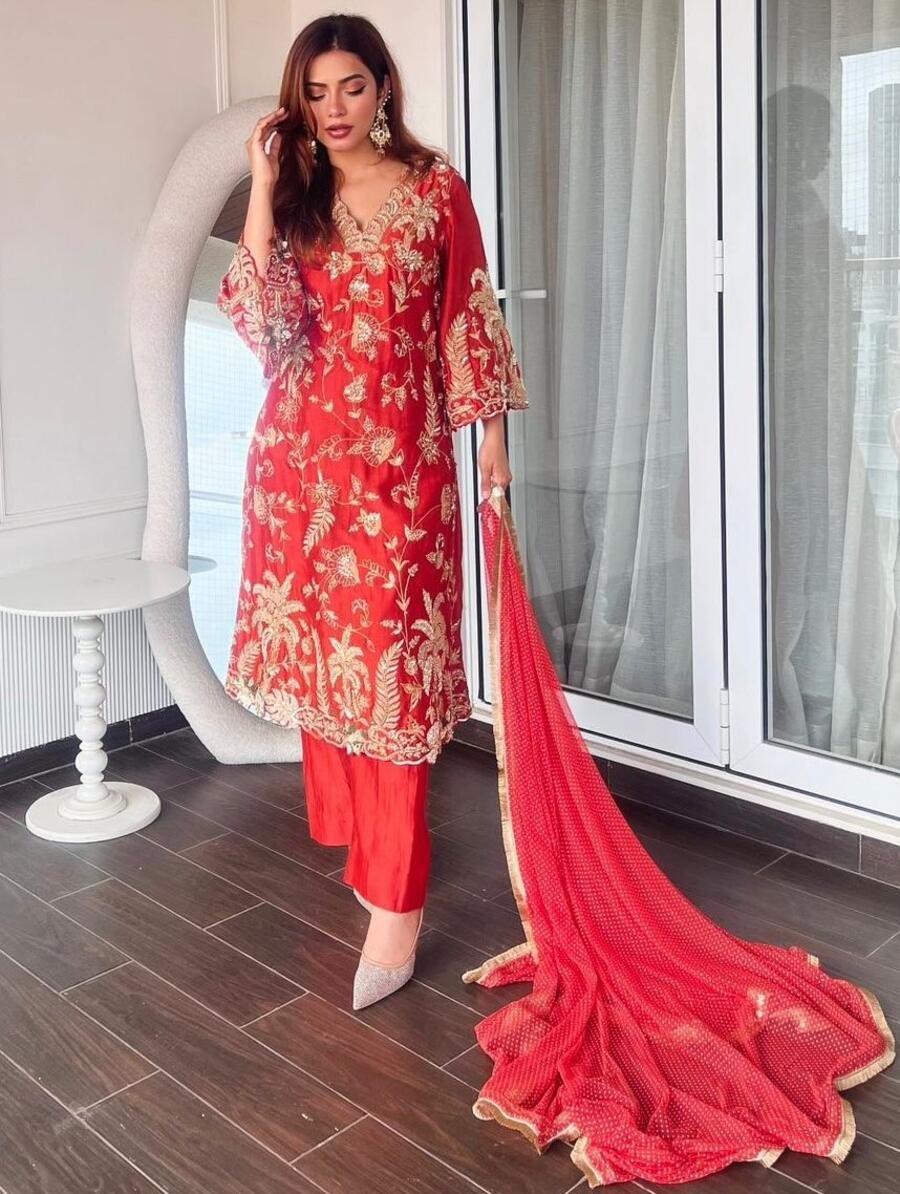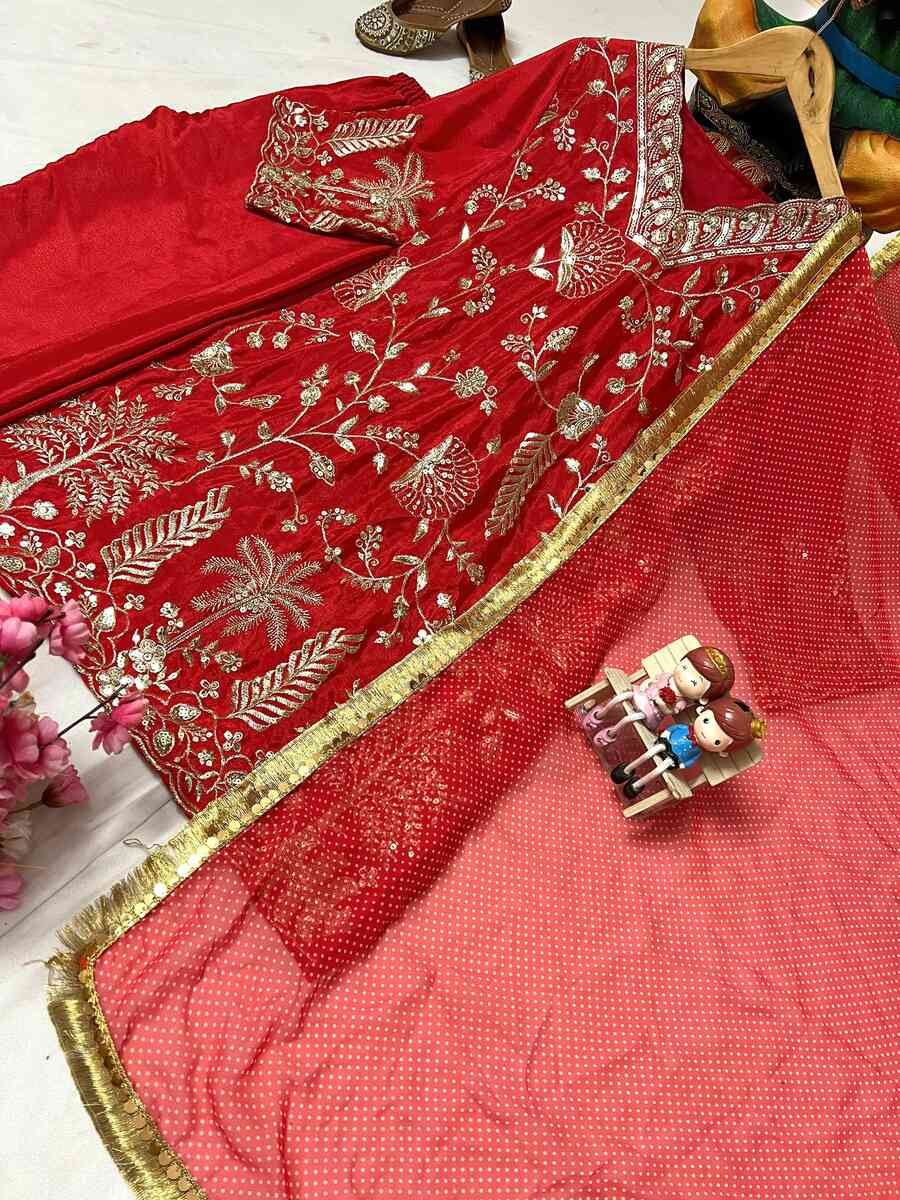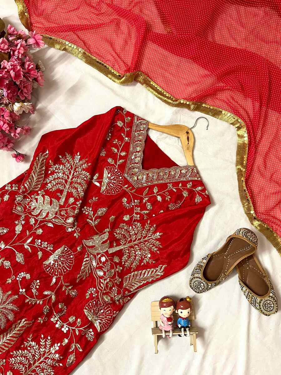 ATTRACTIVE CHINON SILK ZARI,SEQUENCE EMBROIDERY WORK TOP BOTTOM WITH DUPATTA RED