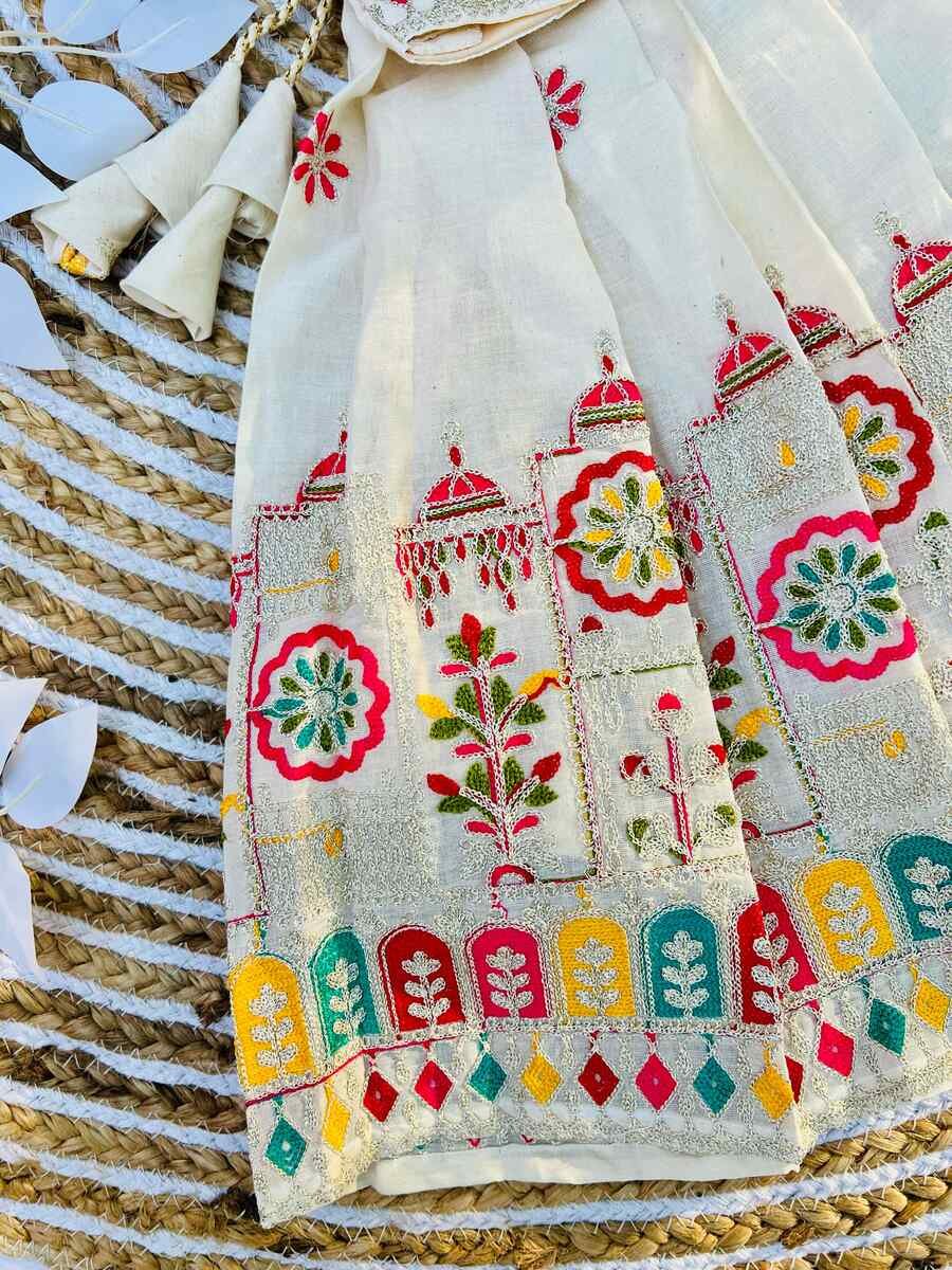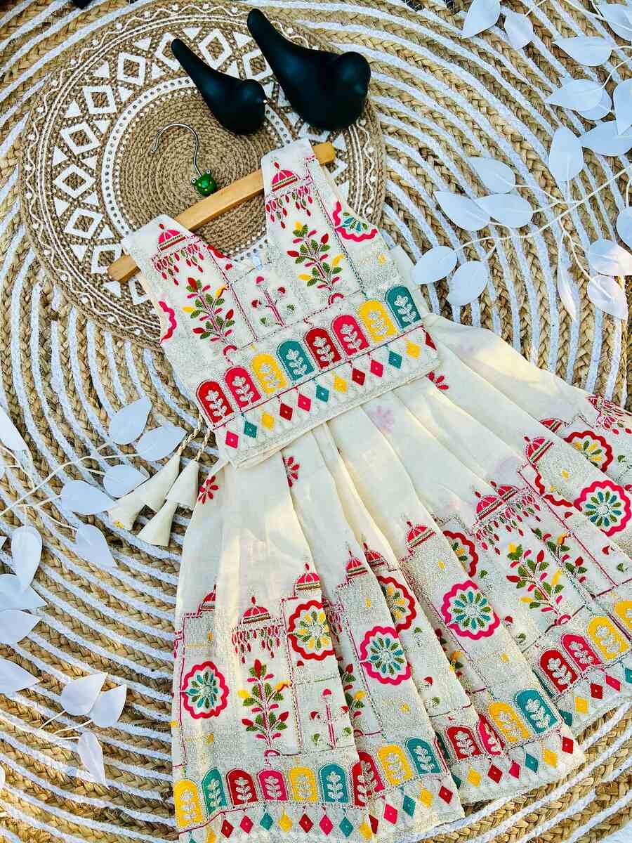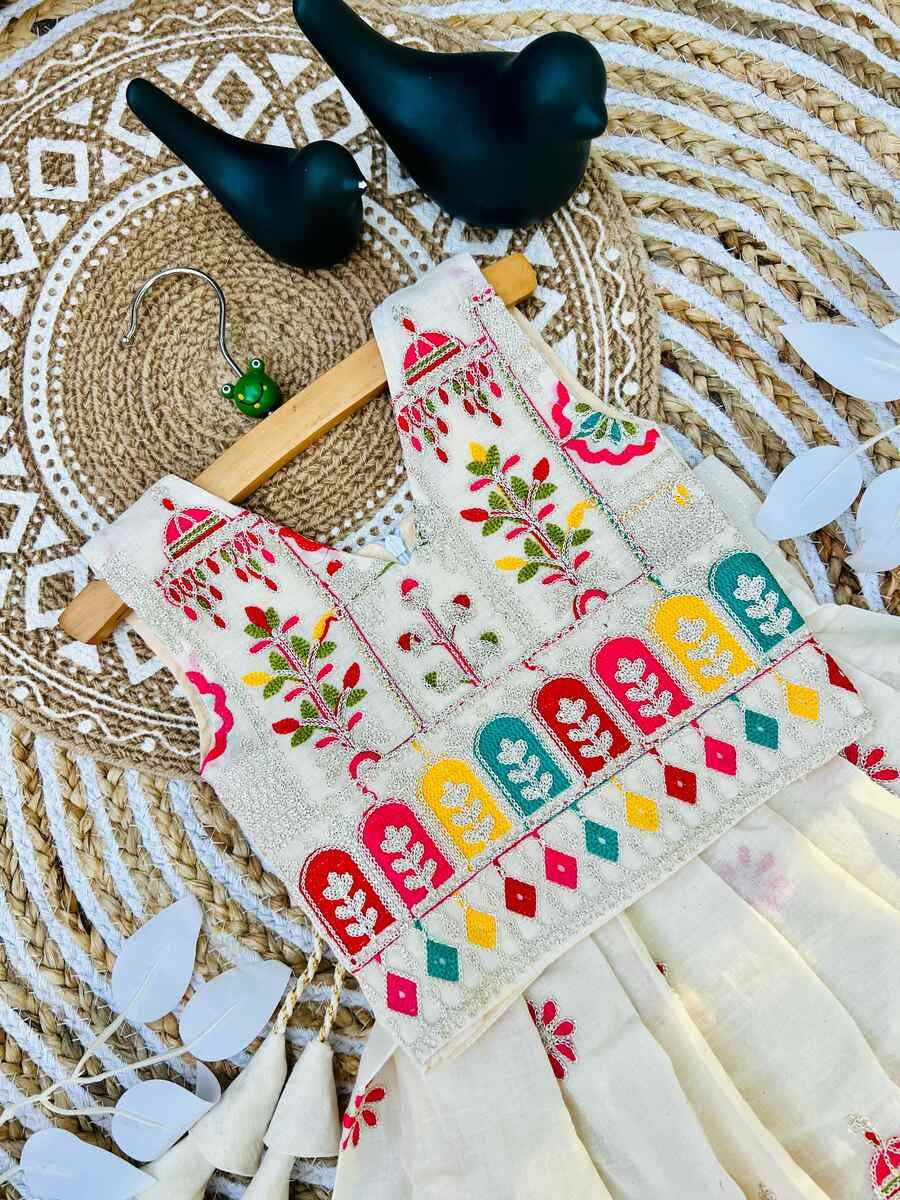 ATTRACTIVE COTTON THREAD EMBROIDERY WORK KID’S LEHENGA CHOLI WHITE