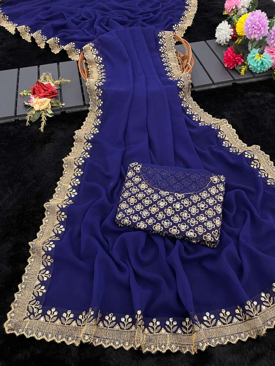 ATTRACTIVE GEORGETTE EMBROIDERY CUTWORK LACE SAREE WITH UNSTITCHED BLOUSE BLUE