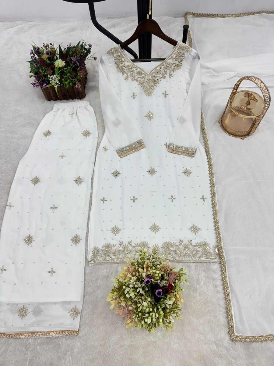WORK : ATTRACTIVE EMBROIDERY SEQUENCE WORK AND RIVETED MOTI WORK