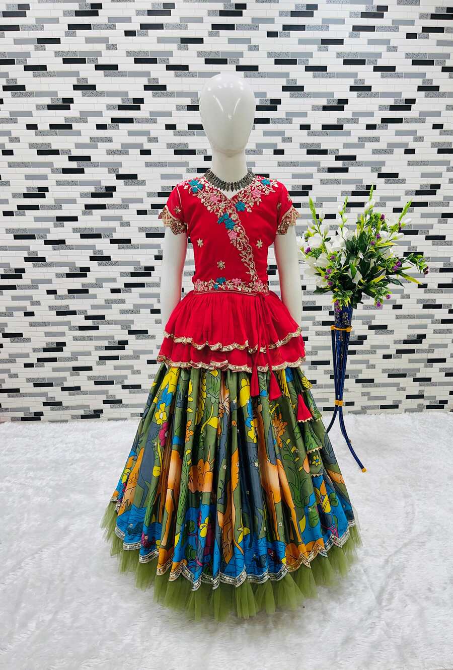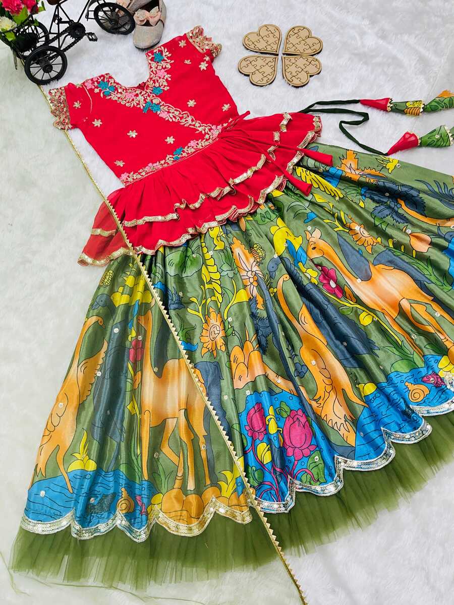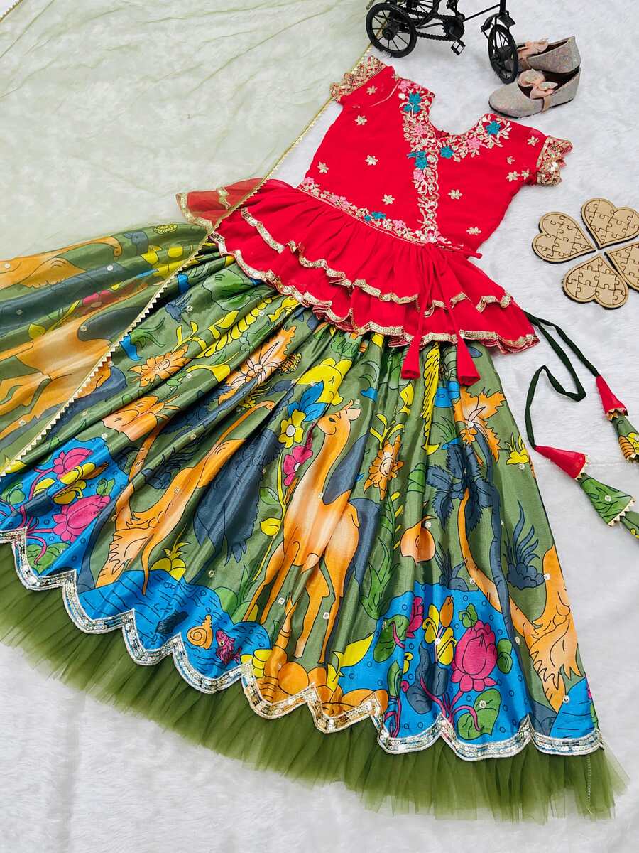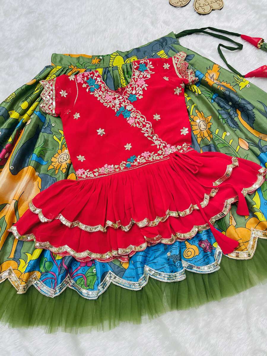 ATTRACTIVE GEORGETTE EMBROIDERY SEQUENCE WORK KIDS TOP LEHENGA WITH DUPATTA PARROT GREEN