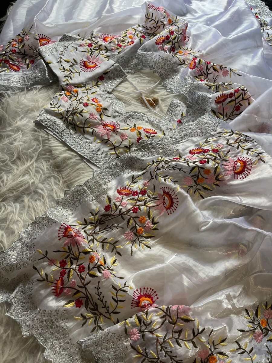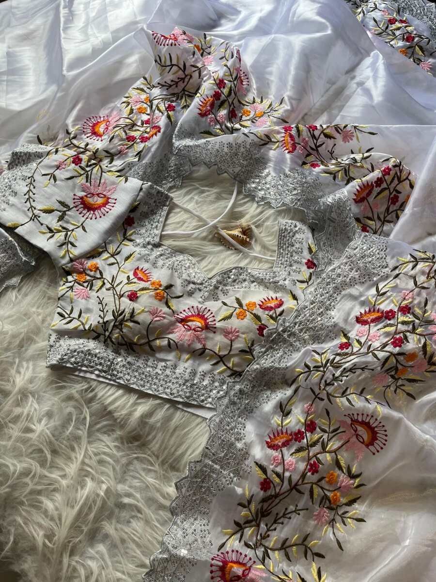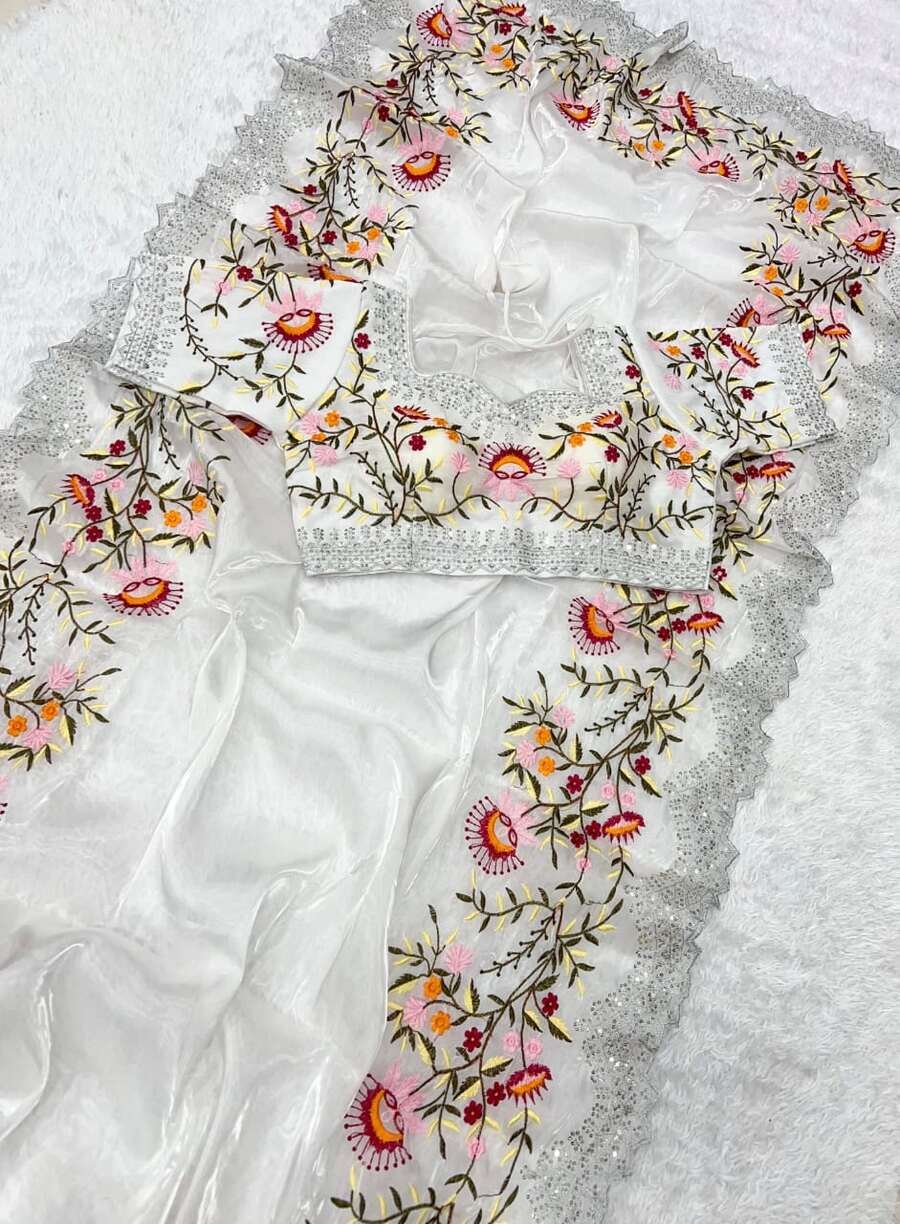 ATTRACTIVE GEORGETTE EMBROIDERY SEQUENCE WORK SAREE WITH FULLY STITCHED BLOUSE WHITE