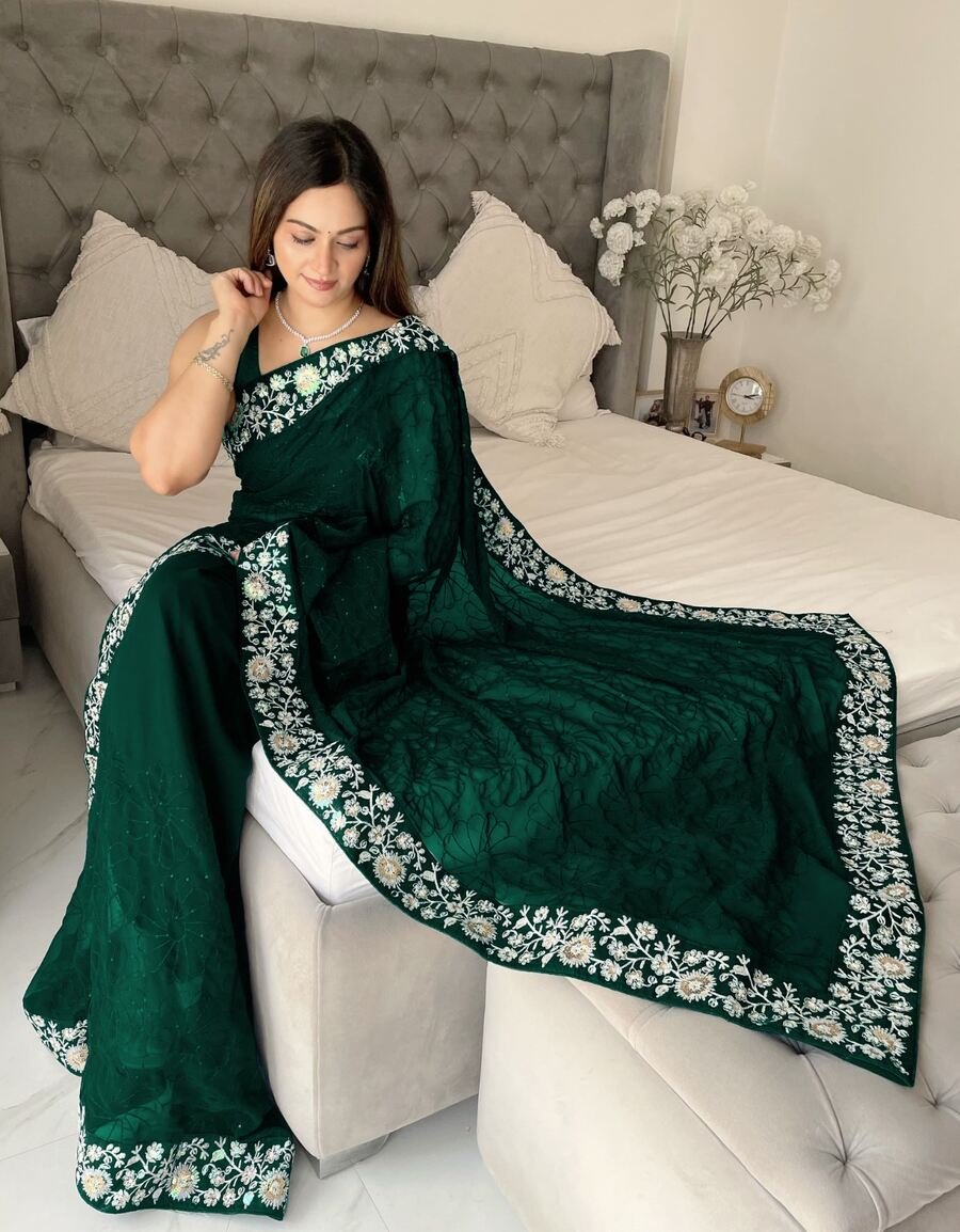 ATTRACTIVE GEORGETTE EMBROIDERY SEQUENCE WORK WITH SEQUENCE LACE SAREE WITH UNSTITCHED BLOUSE GREEN