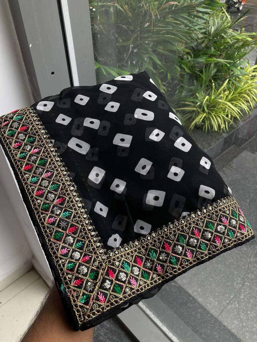 WORK : RAJWADI BANDHEJ PRINT WITH HEAVY EMBROIDERY WORK LACE BORDER