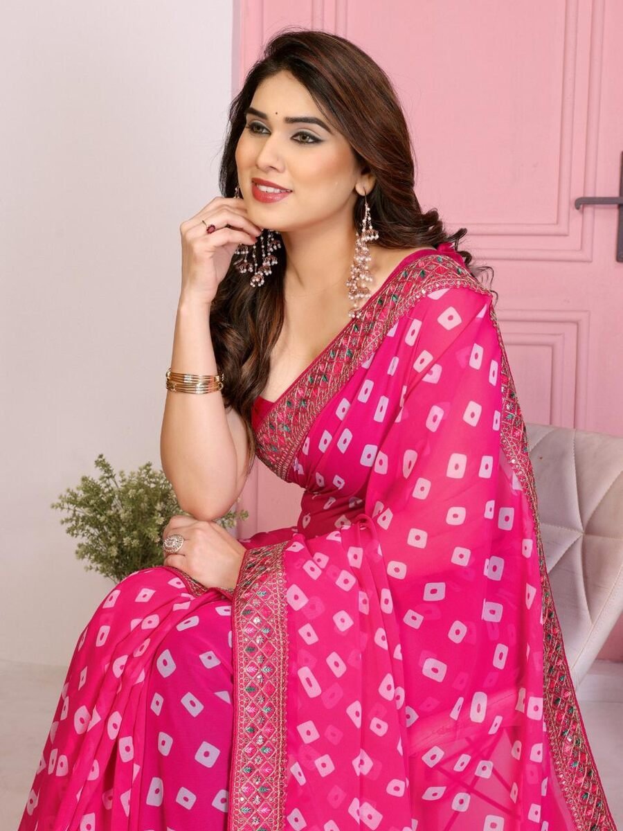 ATTRACTIVE GEORGETTE RAJWADI BANDHEJ PRINT WITH EMBROIDERY WORK SAREE WITH UNSTITCHED BLOUSE PINK