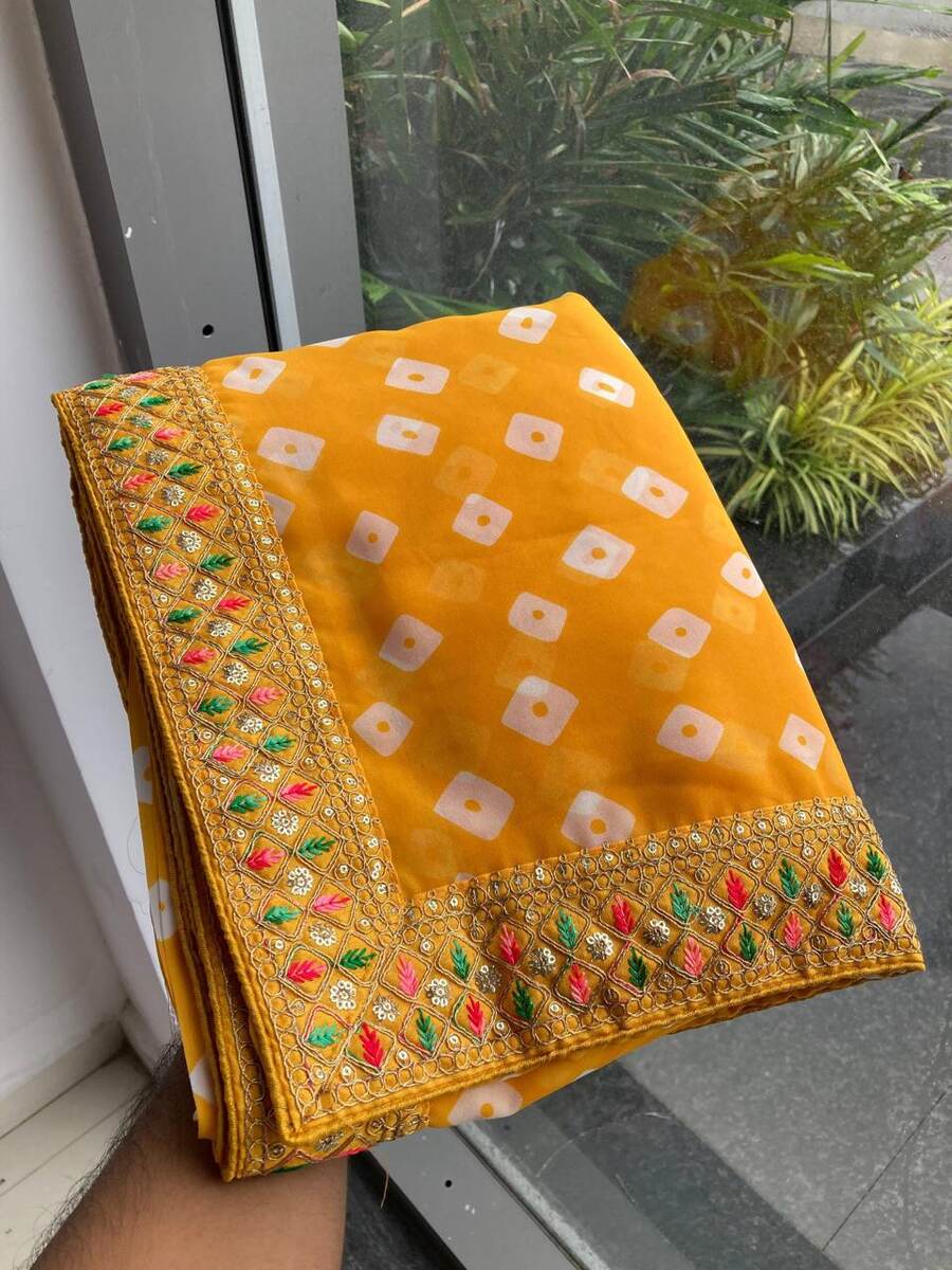 WORK : RAJWADI BANDHEJ PRINT WITH HEAVY EMBROIDERY WORK LACE BORDER