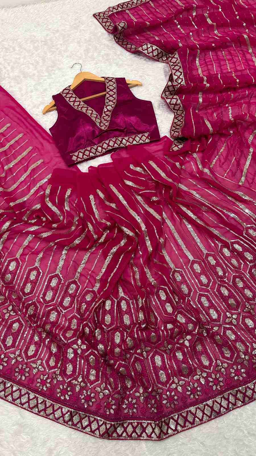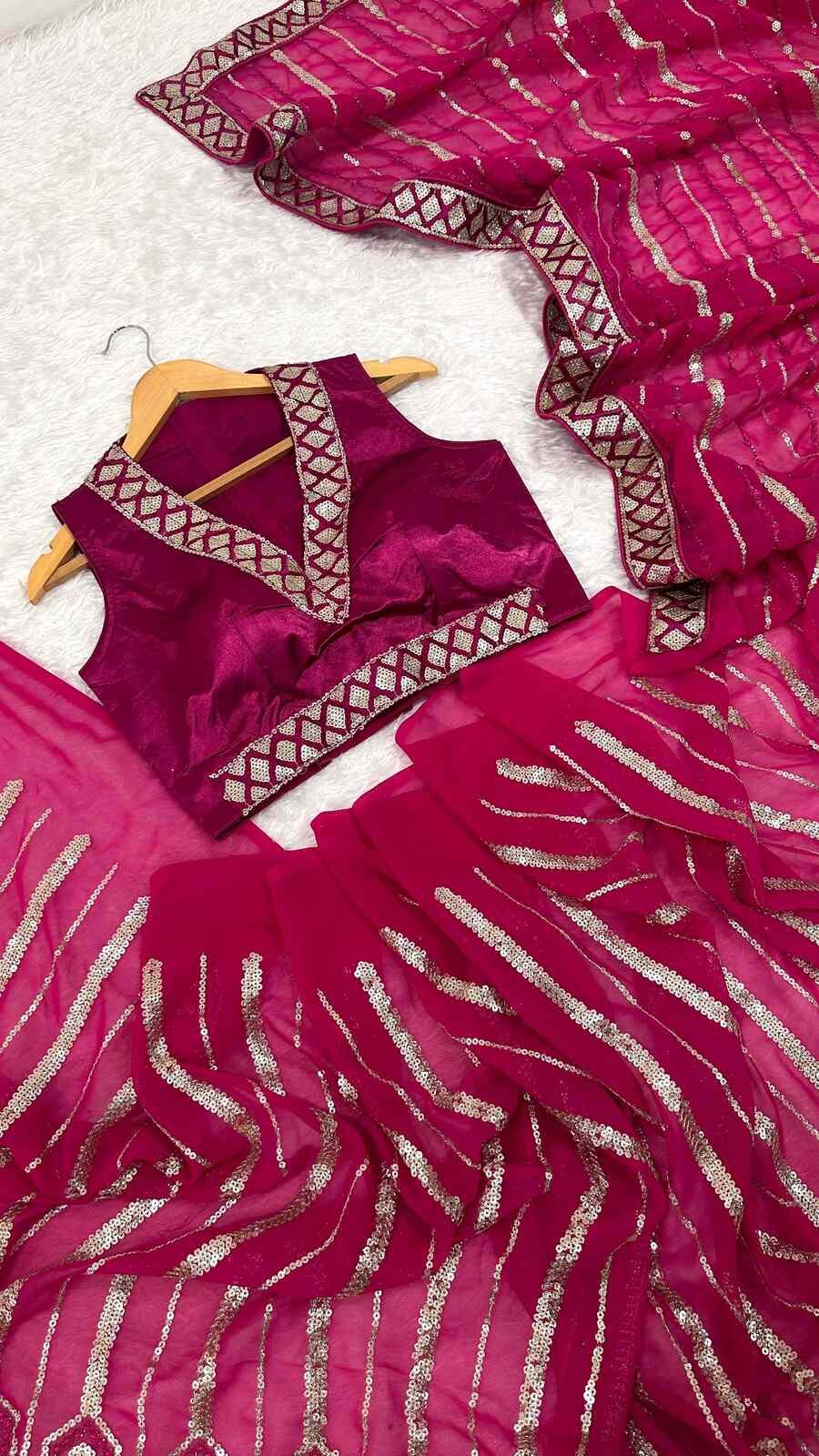 ATTRACTIVE GEORGETTE SEQUENCE , THREAD & DORI WORK SAREE WITH UNSTITCHED BLOUSE PINK