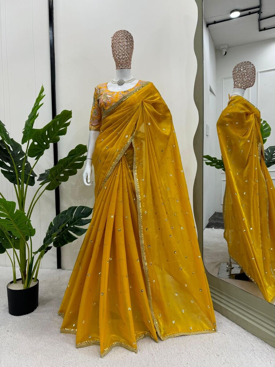 ATTRACTIVE JIMMY CHOO THREAD AND SEQUENCE WORK SAREE WITH UNSTITCHED BLOUSE YELLOW