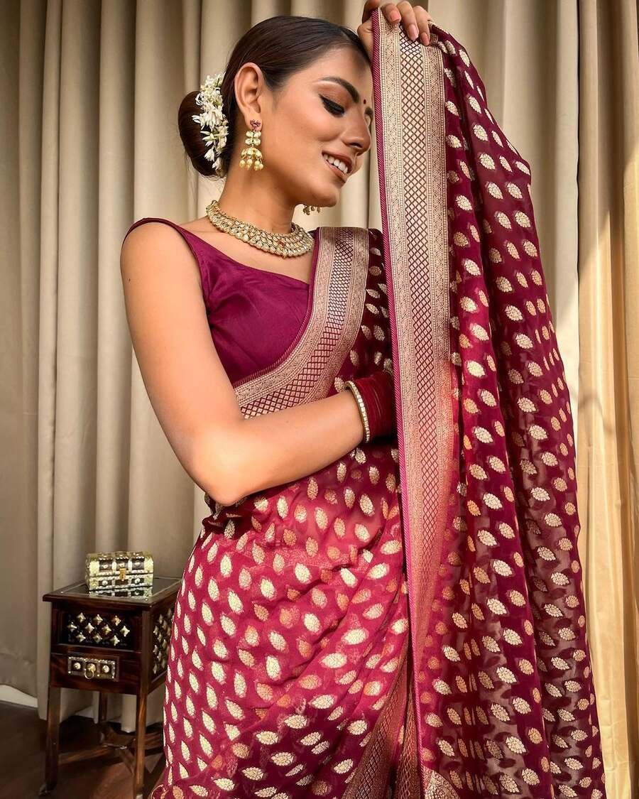 ATTRACTIVE LICHI SILK JACQUARD WORK SAREE WITH UNSTITCHED BLOUSE WINE