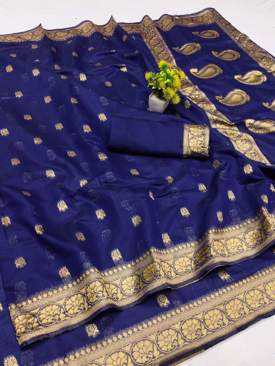 ATTRACTIVE LINEN WEAVING WORK SAREE WITH UNSTITCHED BLOUSE NAVY BLUE