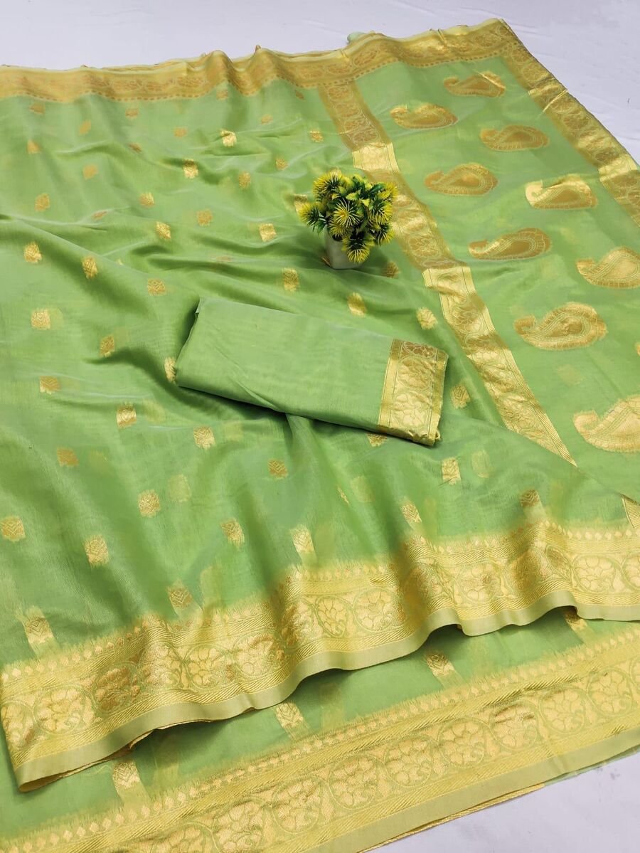 ATTRACTIVE LINEN WEAVING WORK SAREE WITH UNSTITCHED BLOUSE PARROT GREEN