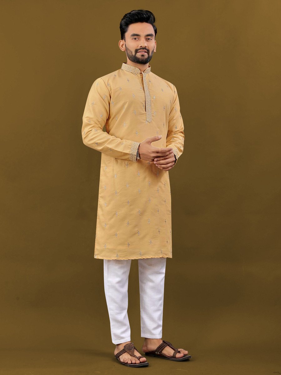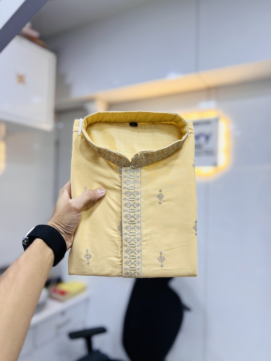 ATTRACTIVE MATKA SILK SILVER JARI WITH EMBROIDERY BUTI KURTA PAYJAMA YELLOW