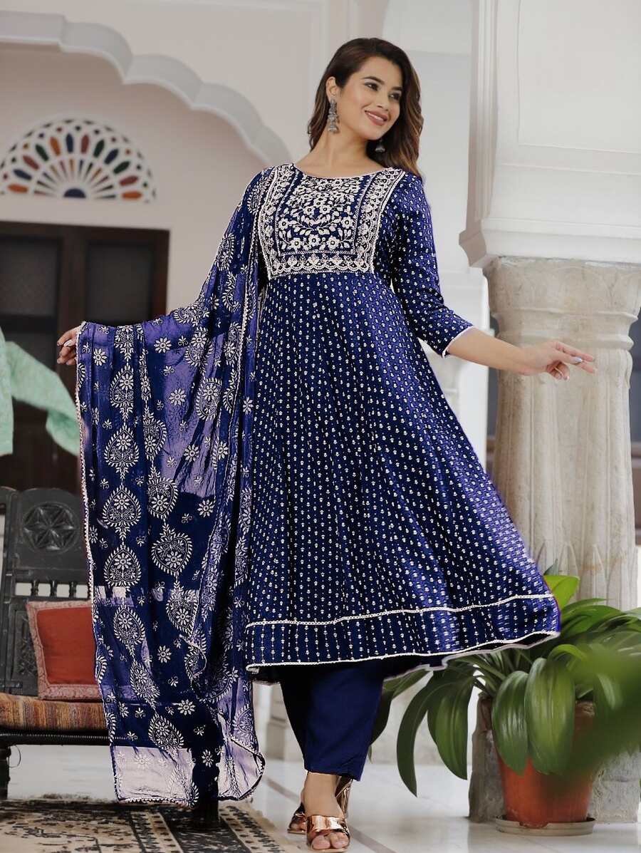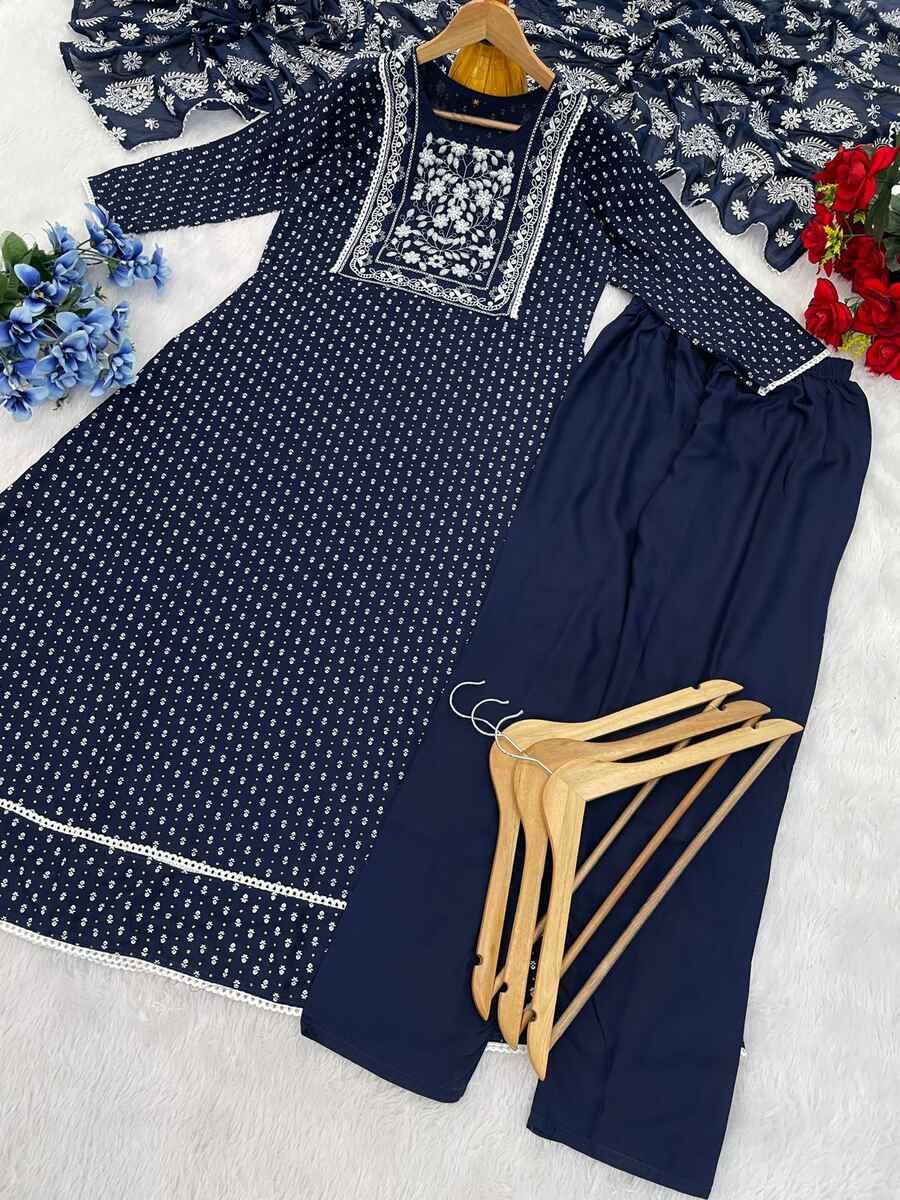 ATTRACTIVE RAYON EMBROIDERY FOIL PRINTED TOP BOTTOM WITH CHINON DUPATTA BLUE