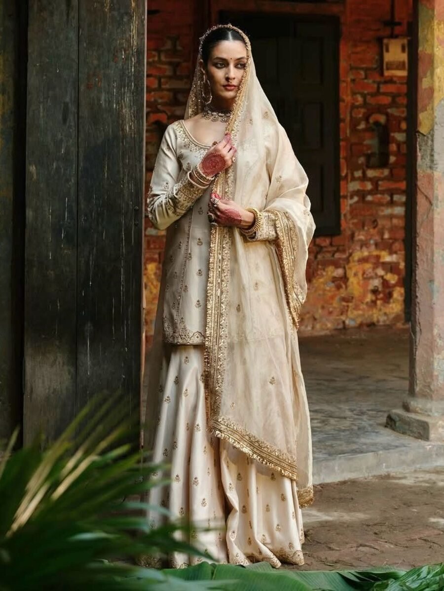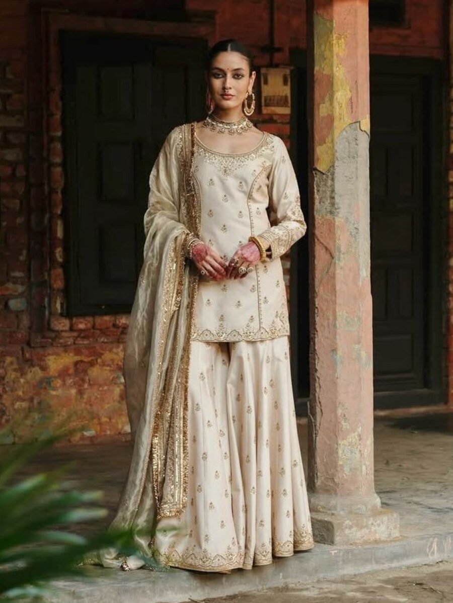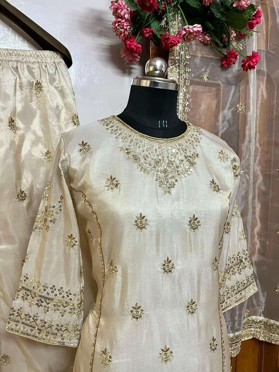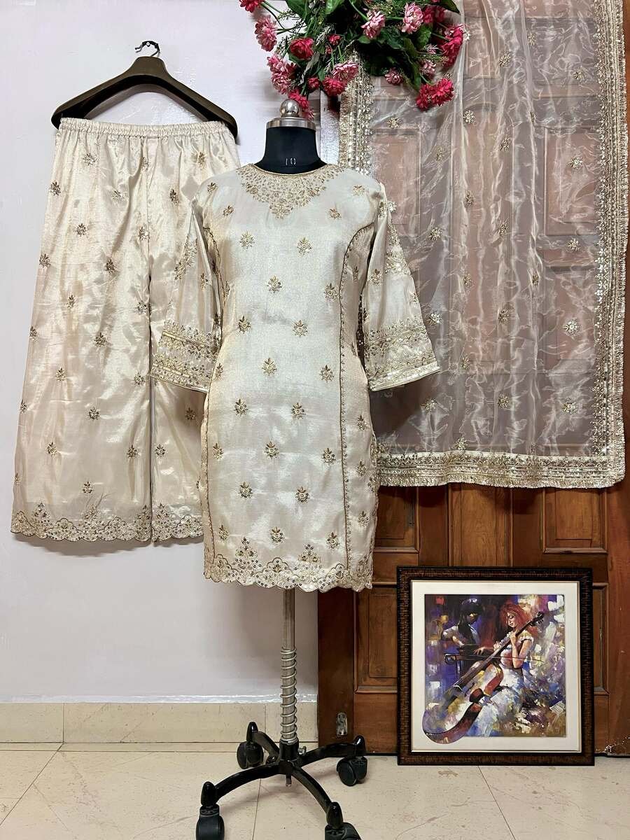 ATTRACTIVE SHIMMER SILK SEQUENCE ZARI EMBROIDERY WORK TOP PALAZZO WITH DUPATTA OFF WHITE