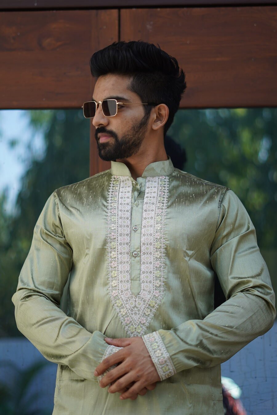 ATTRACTIVE SHINY SILK CODING WORK MEN’S KURTA PAYJAMA PISTA