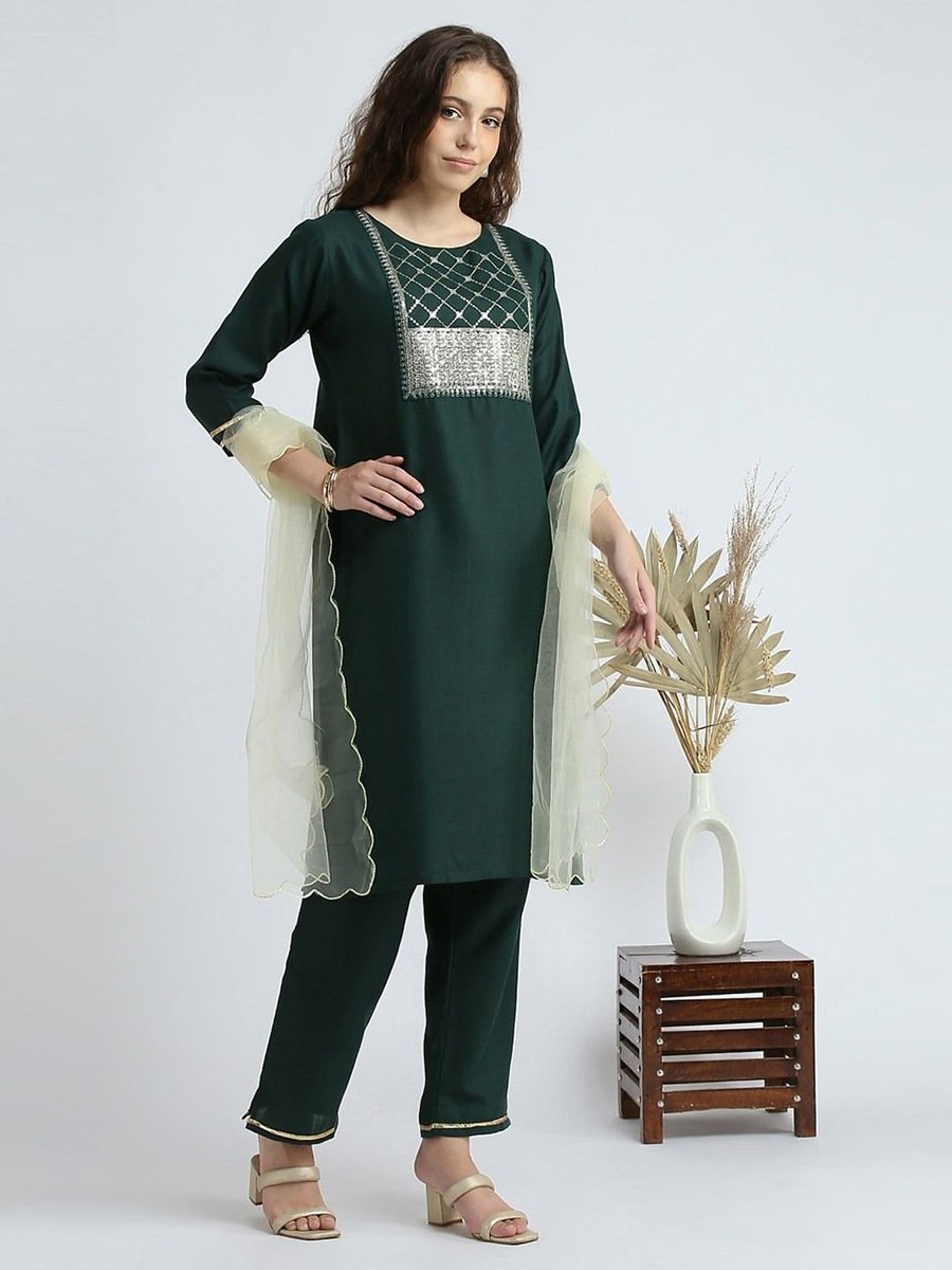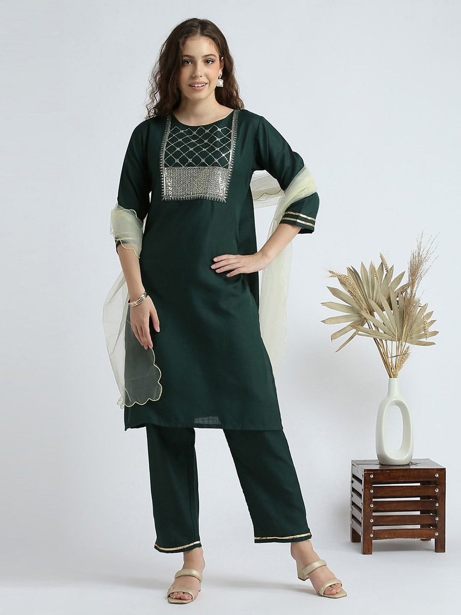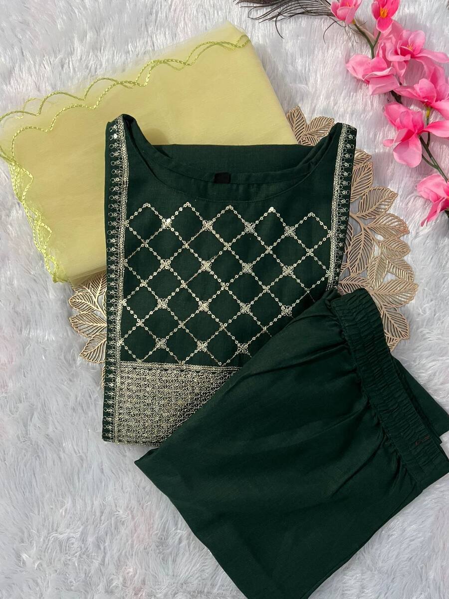 ATTRACTIVE SLUB COTTON EMBROIDERY SEQUENCE WORK TOP BOTTOM WITH DUPATTA GREEN