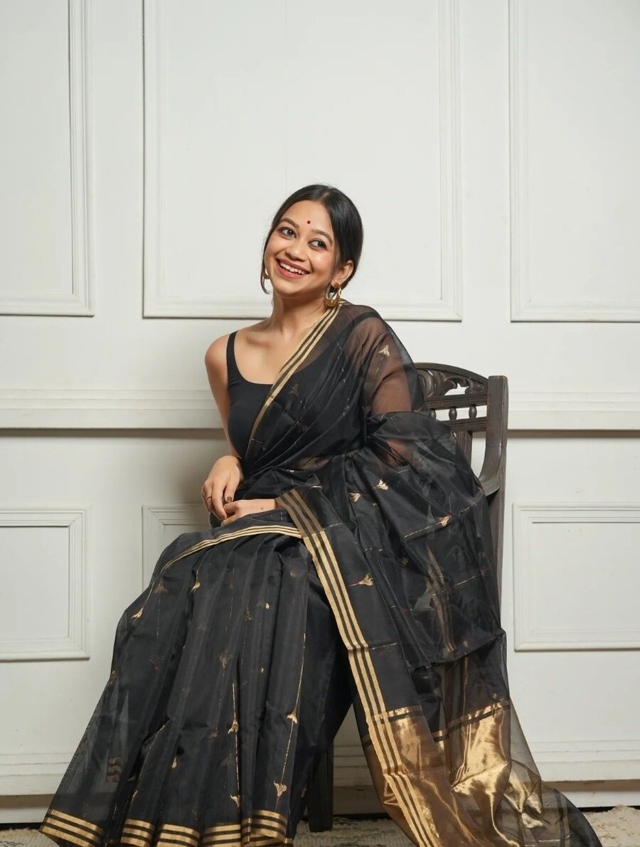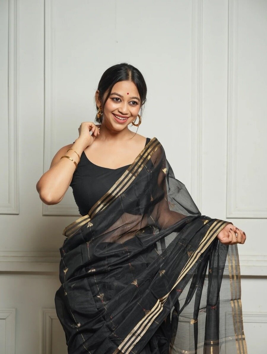 ATTRACTIVE SOFT COTTON WEAVING JAQUARD BORDER SAREE WITH UNSTITCHED BLOUSE BLACK