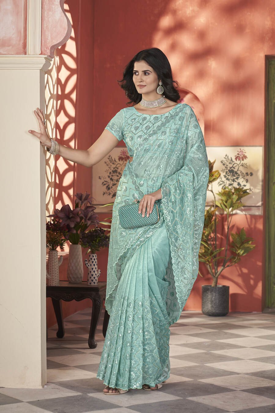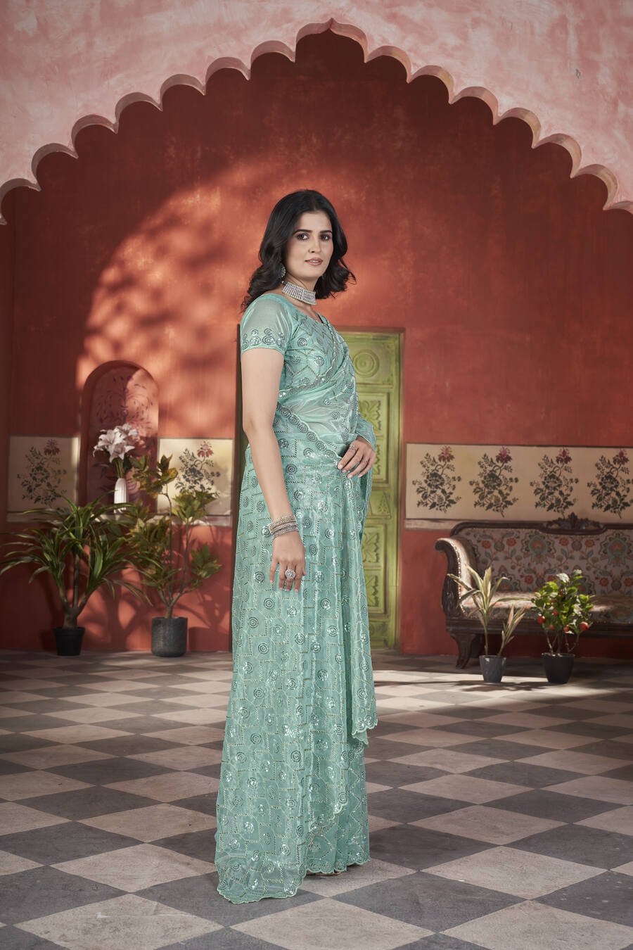 ATTRACTIVE TISSUE NET SEQUENCE & PITE WORK WITH THREAD EMBROIDERY WORK SAREE WITH UNSTITCHED BLOUSE SKY