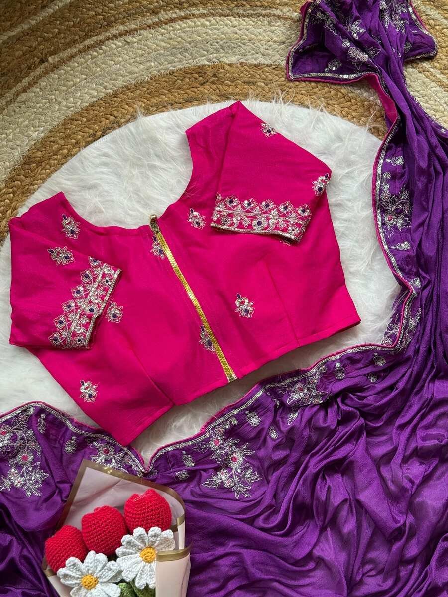 ATTRACTIVE VISCOSE CHINON EMBROIDERY SEQUENCE WITH MULTI THREAD , ZARI WORK SAREE WITH UNSTITCHED BLOUSE PURPLE