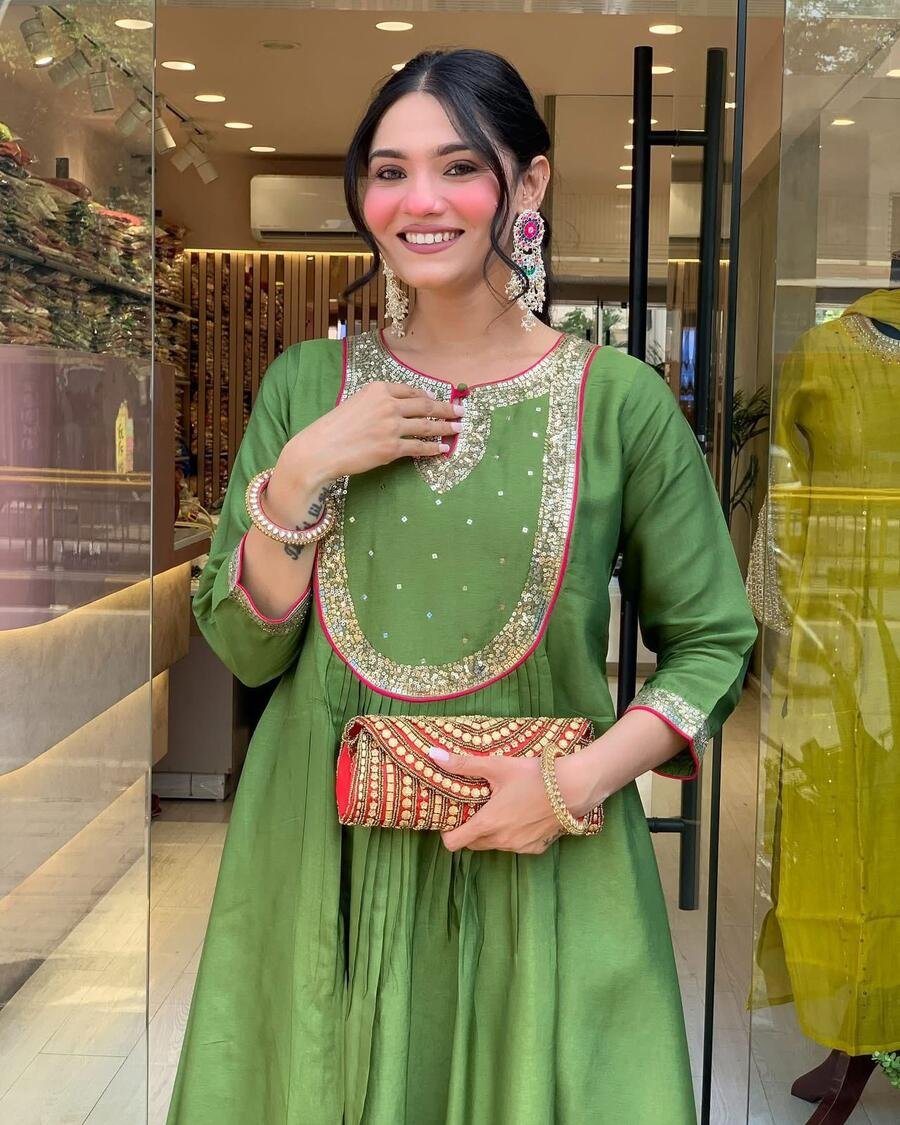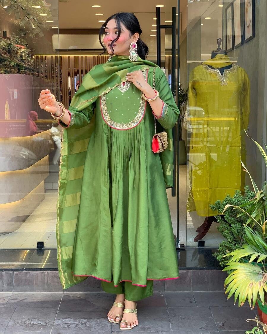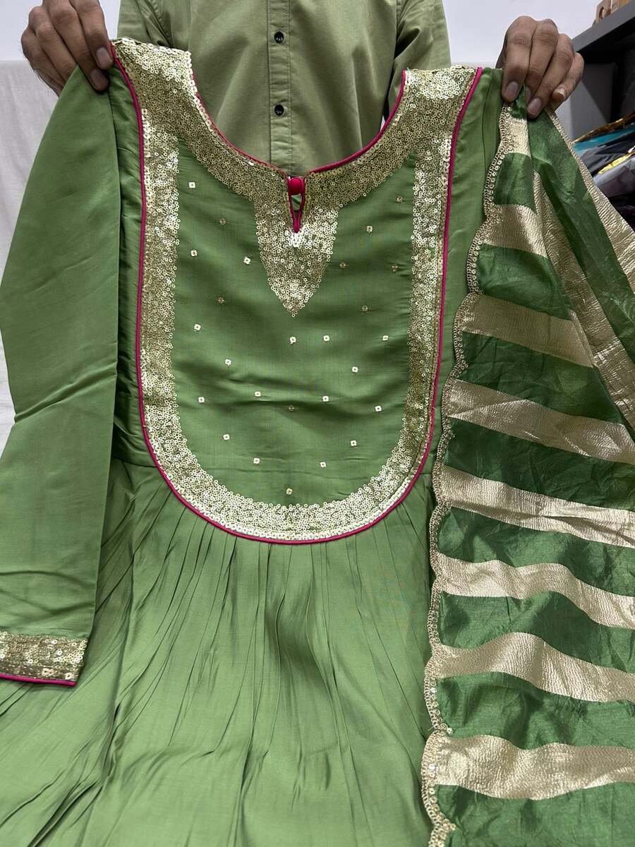ATTRACTIVE VISCOSE ROMAN SILK HAND EMBROIDERY, ZARI WEAVING WORK TOP BOTTOM WITH DUPATTA GREEN