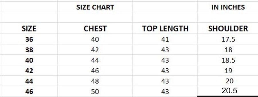 SIZE : XS-34, S-36, M-38, L-40, XL-42, 2XL-44, 3XL-46, 4XL-48, 5XL-50