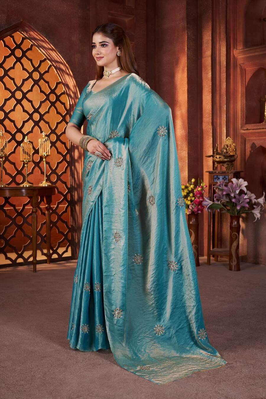 BOLLYWOOD FENDY SATIN SILK BEADS & PIPE HAND WORK BUTTA SAREE WITH UNSTITCHED BLOUSE RAMA