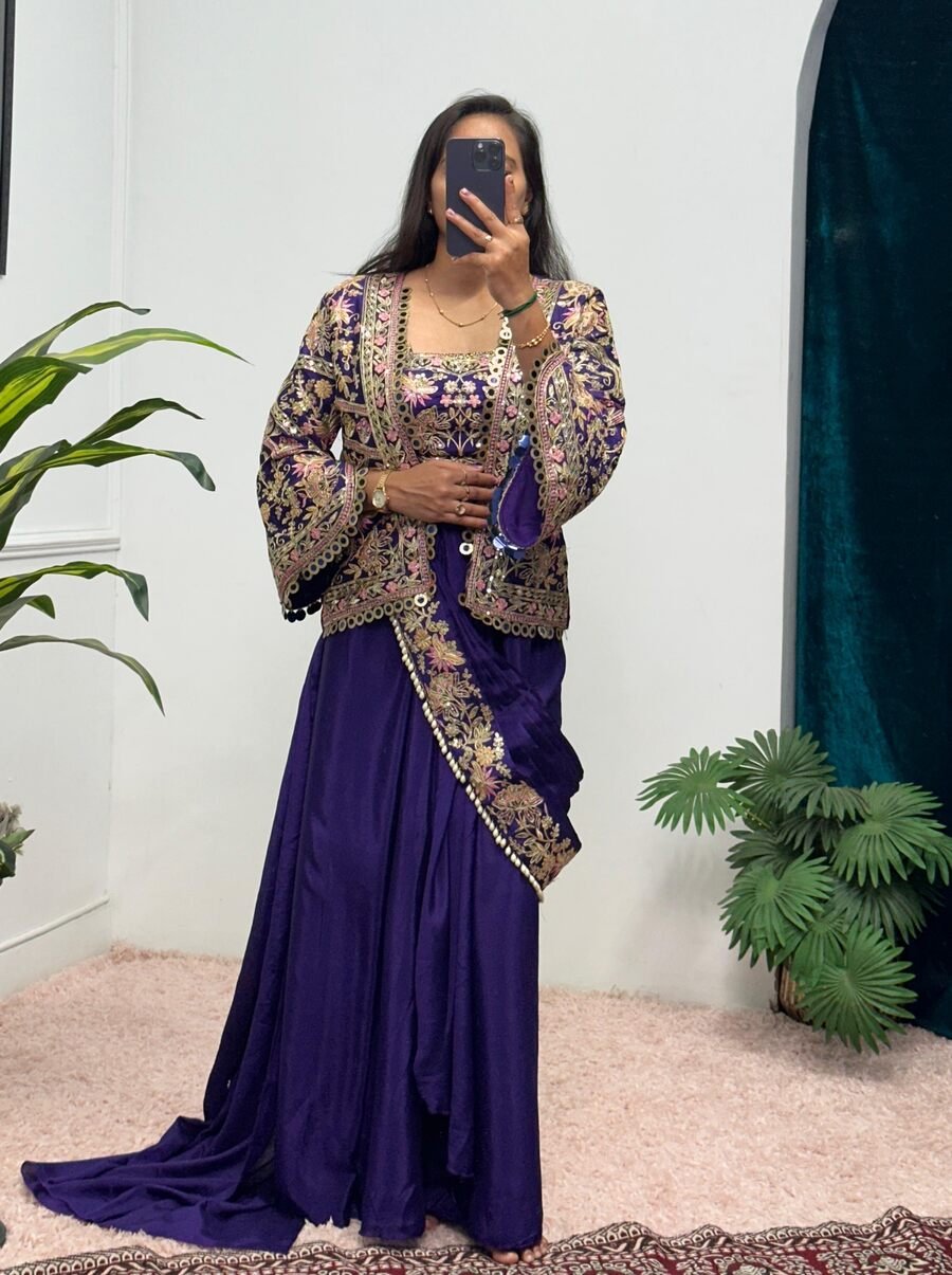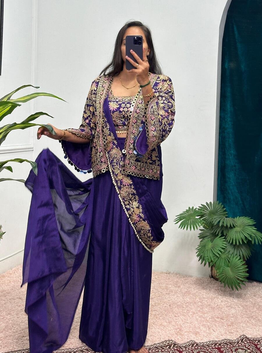 CHINON EMBROIDERY AND MOTI LACE BORDER WORK READY TO WEAR SAREE WITH BLOUSE AND KOTI PURPLE
