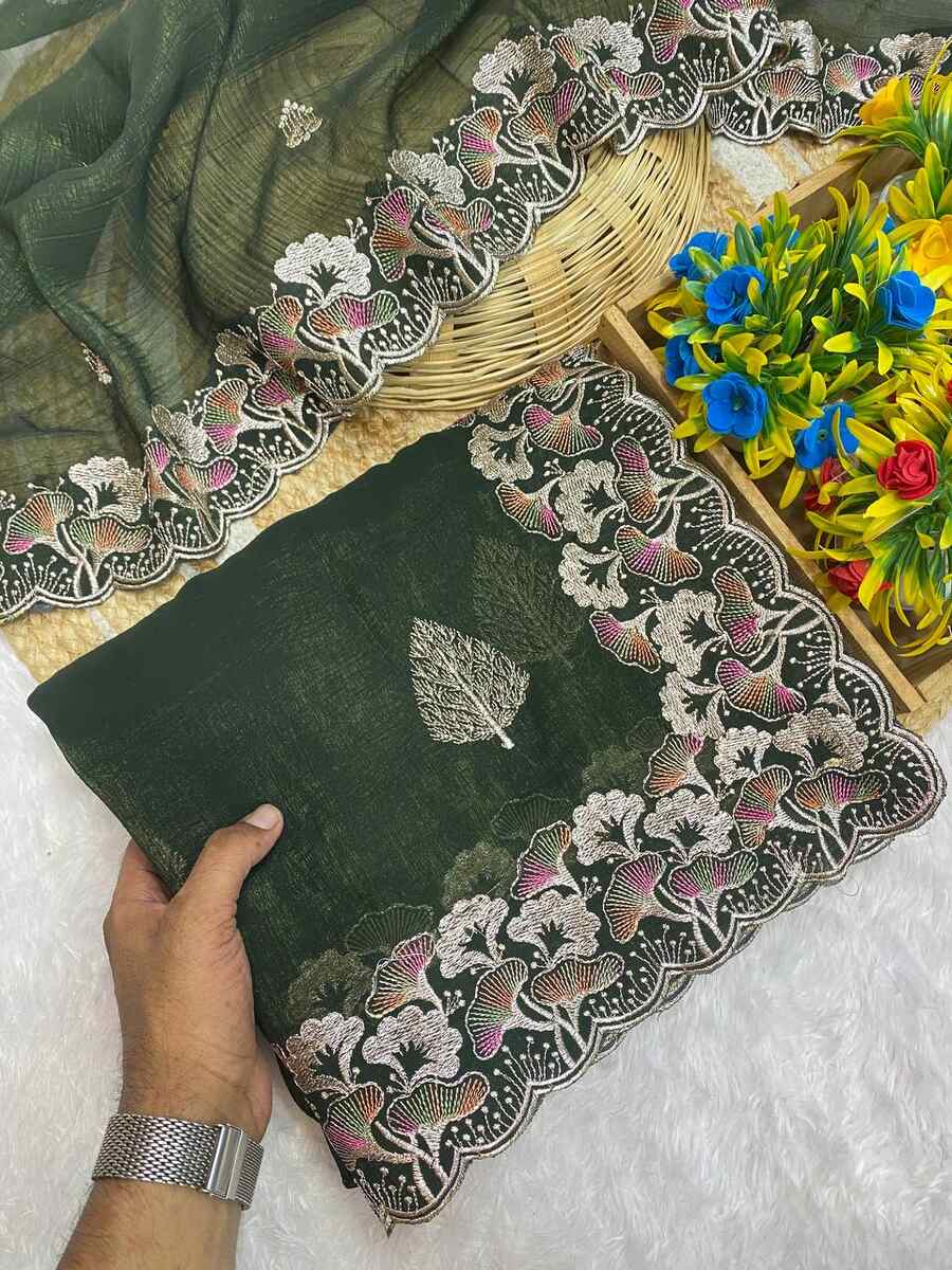 CRUNCHY SILK EMBROIDERY WITH MULTI COLOUR THREAD WORK SAREE WITH UNSTITCHED BLOUSE GREEN