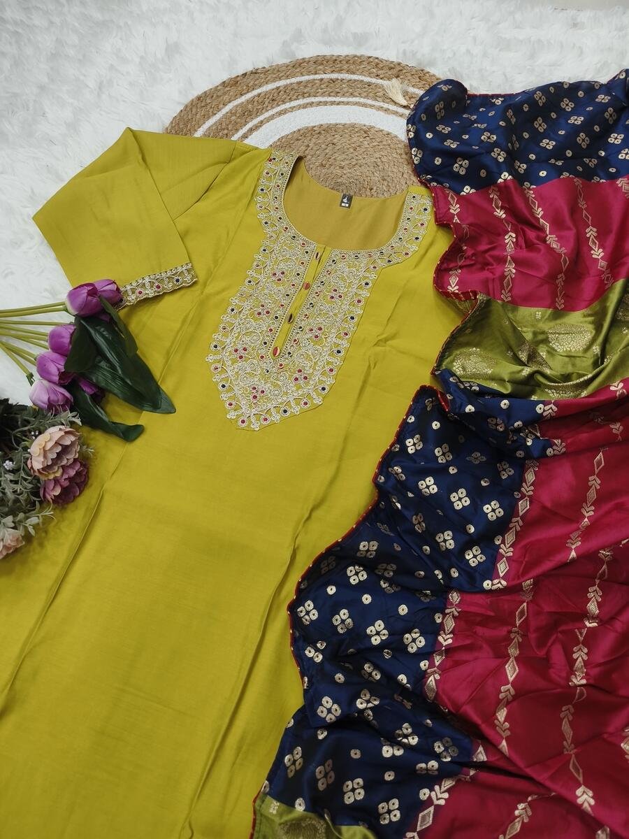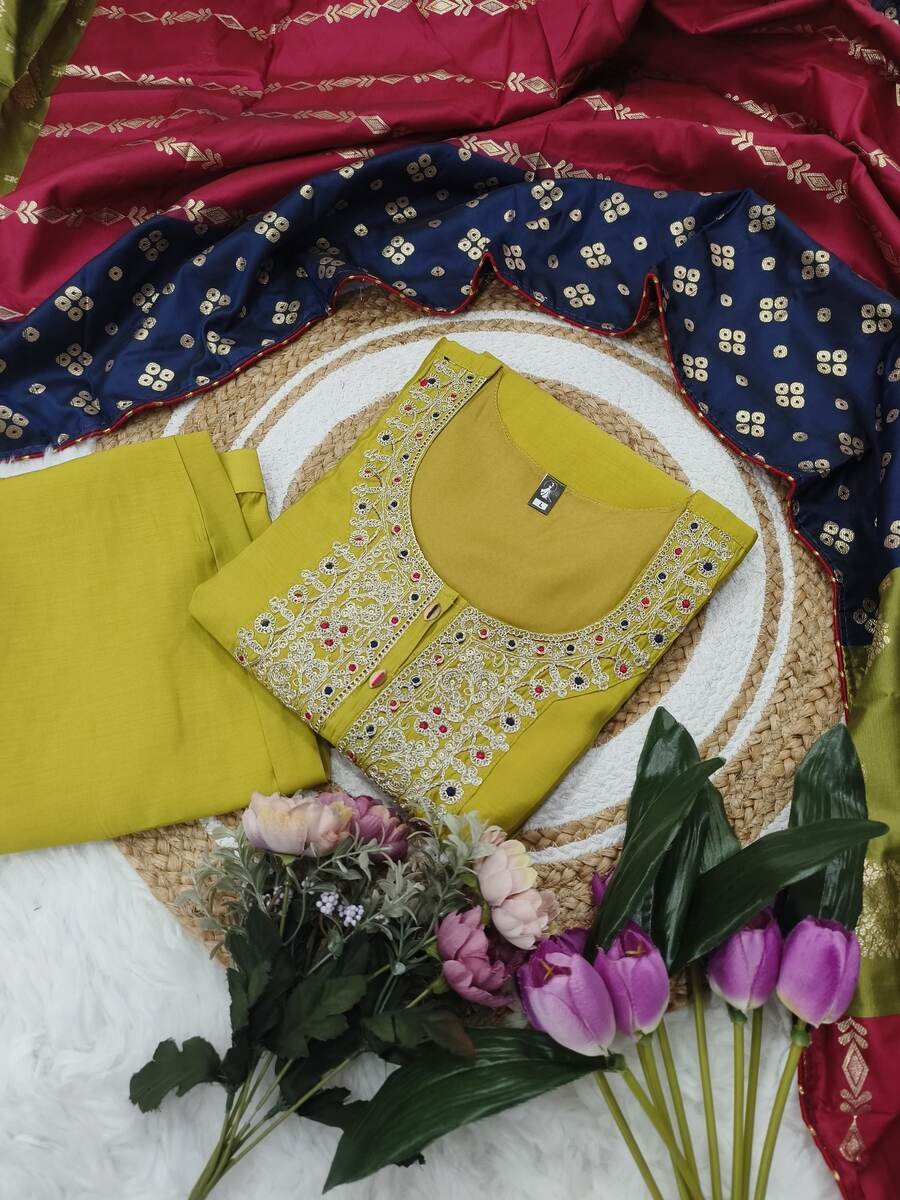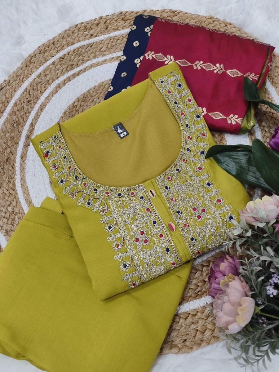 DEISGNER VISCOSE CHANDERI SEQUENCE CODING EMBROIDERY WORK TOP BOTTOM WITH DUPATTA PARROT
