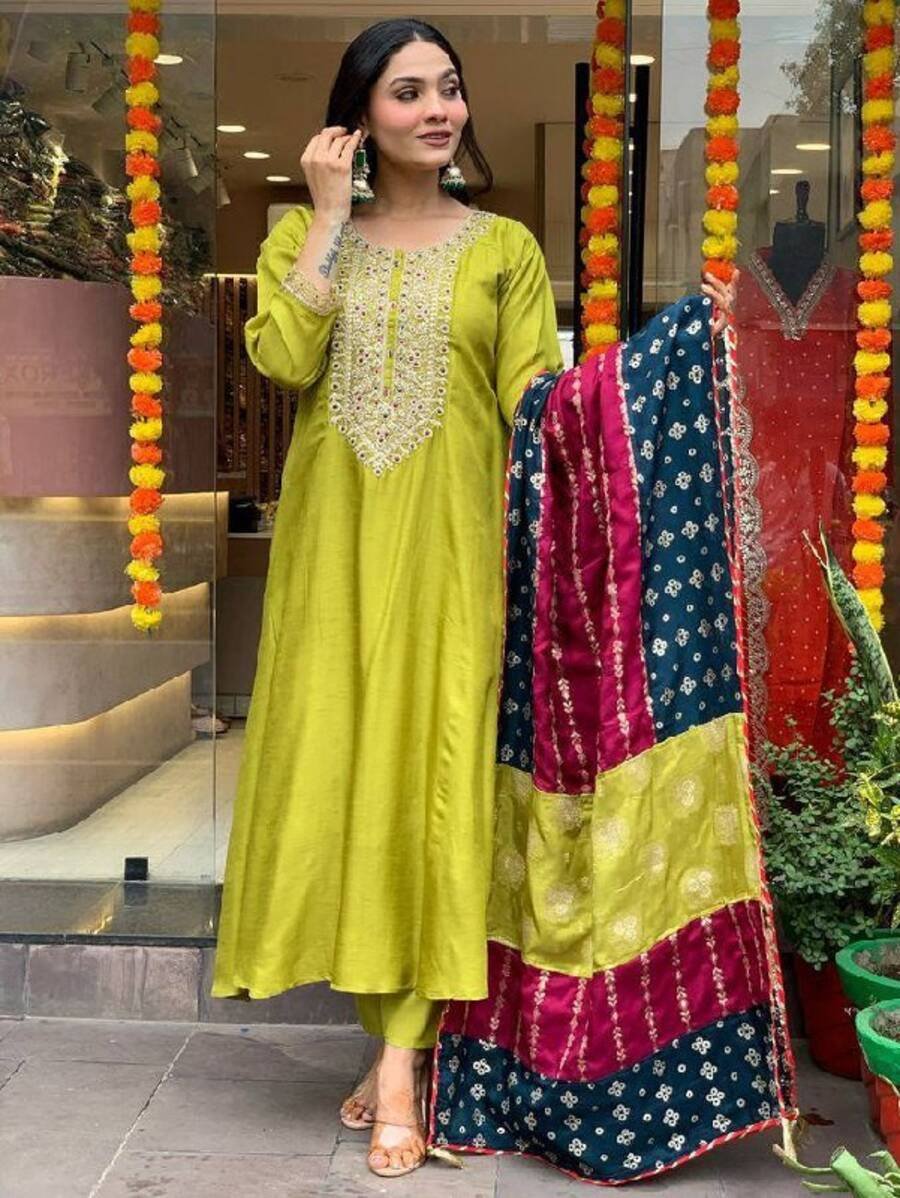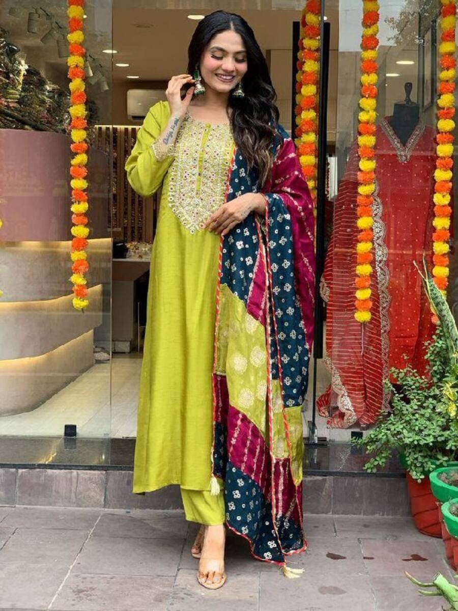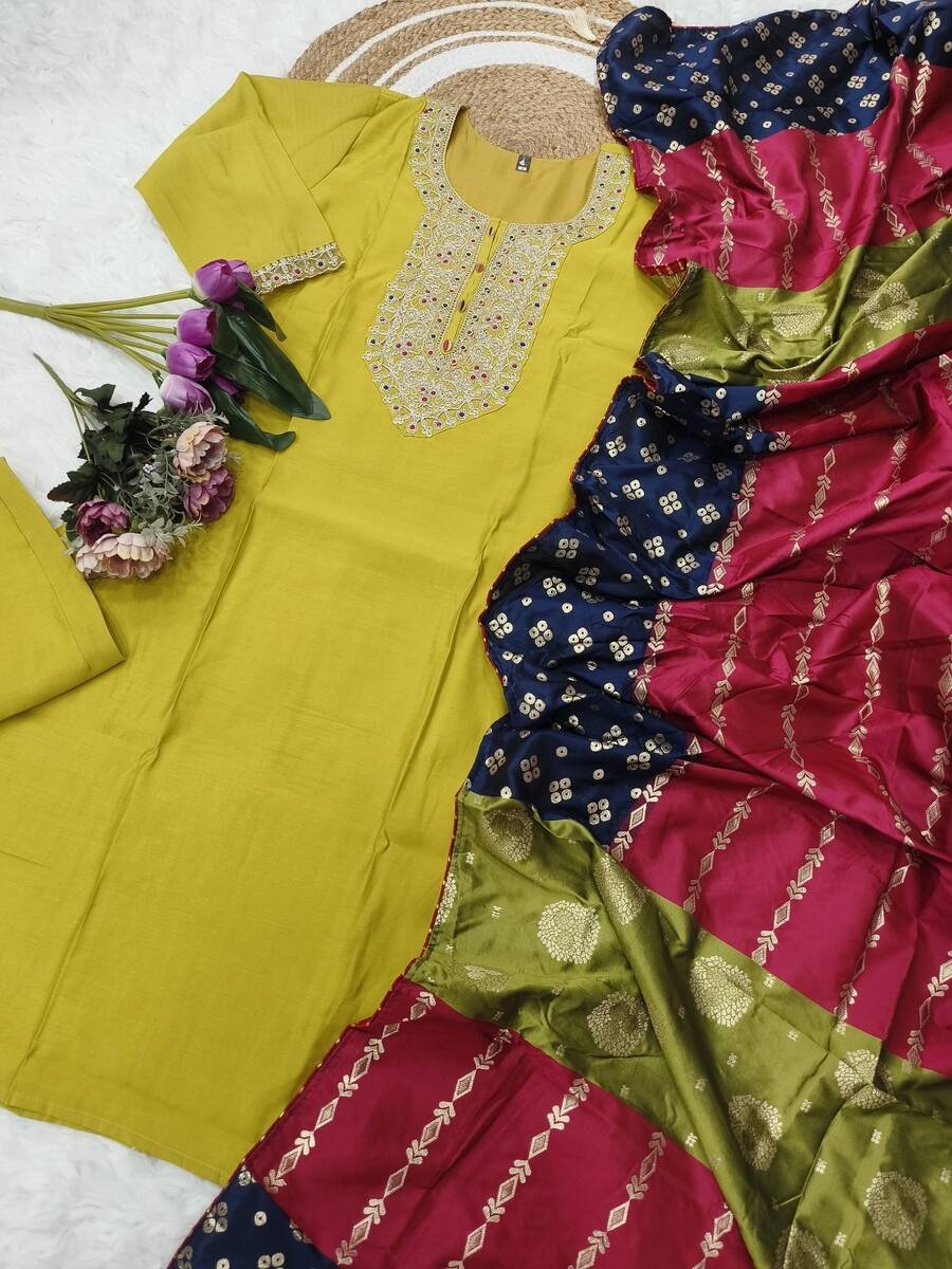 DEISGNER VISCOSE CHANDERI SEQUENCE CODING EMBROIDERY WORK TOP BOTTOM WITH DUPATTA PARROT