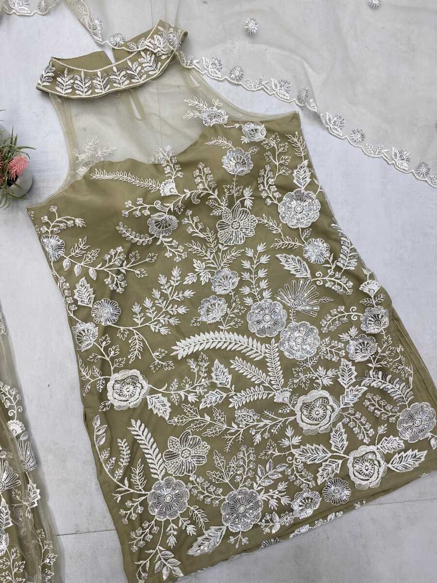 DESIGNER BUTTERFLY NET EMBROIDERY SEQUENCE WORK TOP PALAZZO WITH DUPATTA OLIVE GREEN