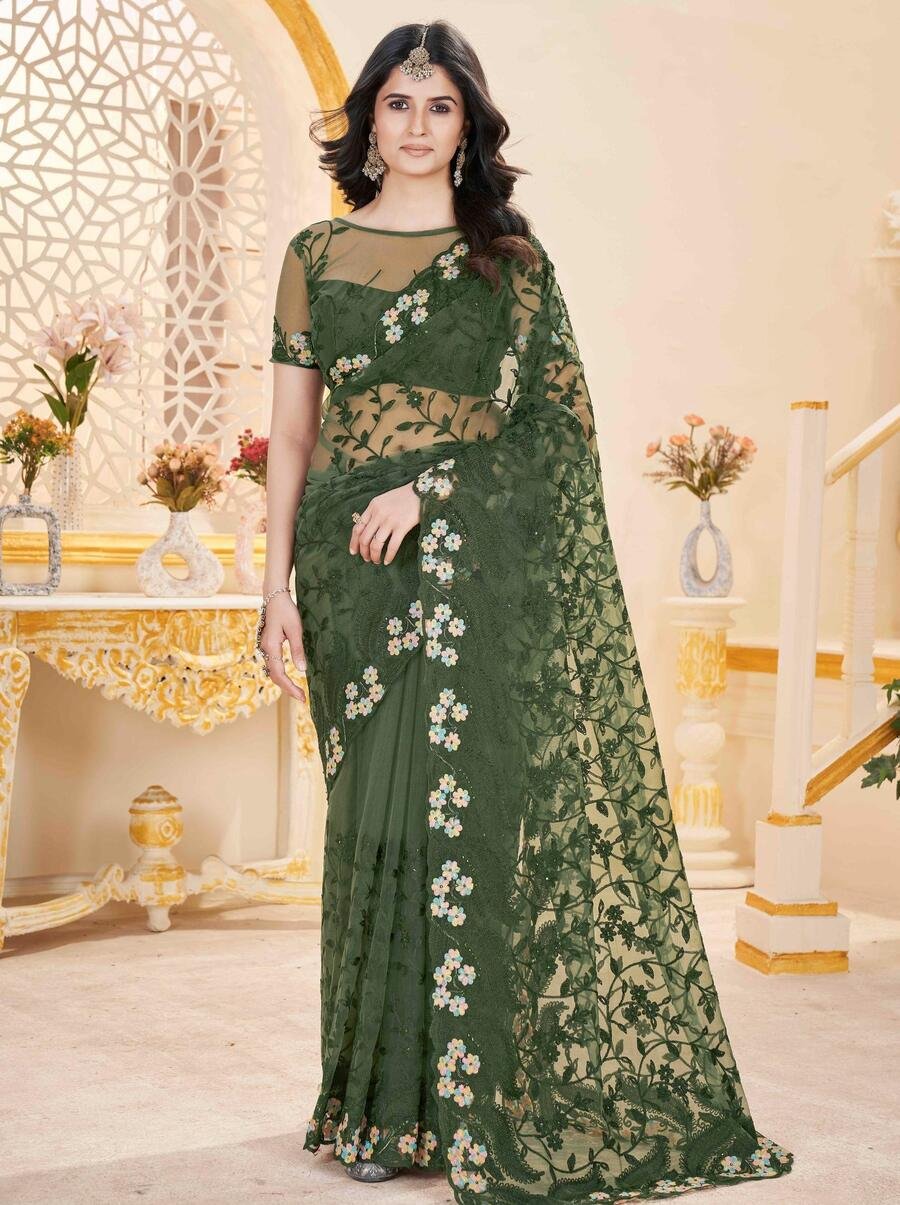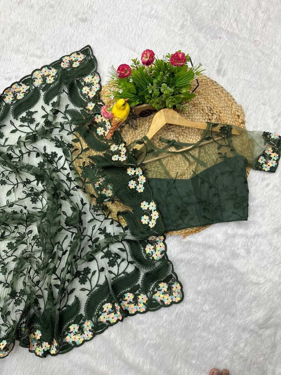 DESIGNER BUTTERFLY NET EMBROIDERY WITH MULTI COLOR THREAD AND STONE WITH CUTWORK BORDER SAREE WITH UNSTITCHED BLOUSE GREEN