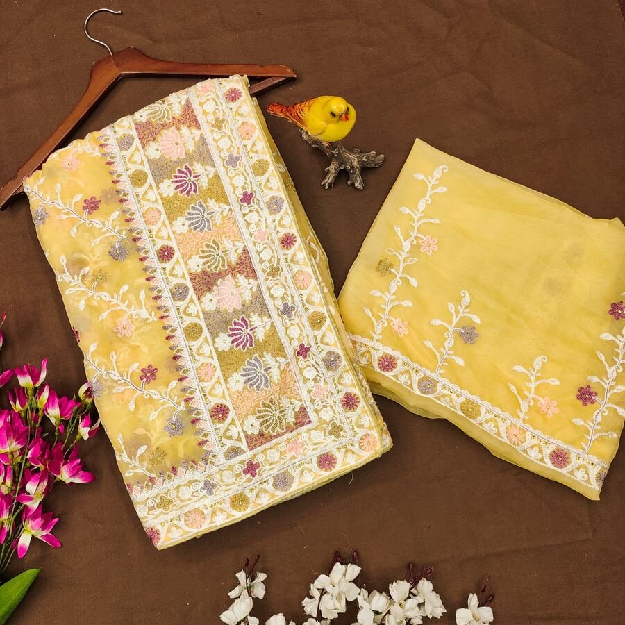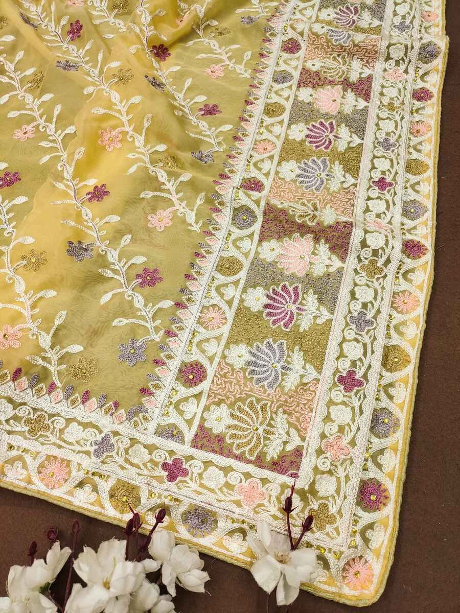 DESIGNER BUTTERFLY NET EMBROIDERY WITH STONE WORK SAREE WITH UNSTITCHED BLOUSE LEMON