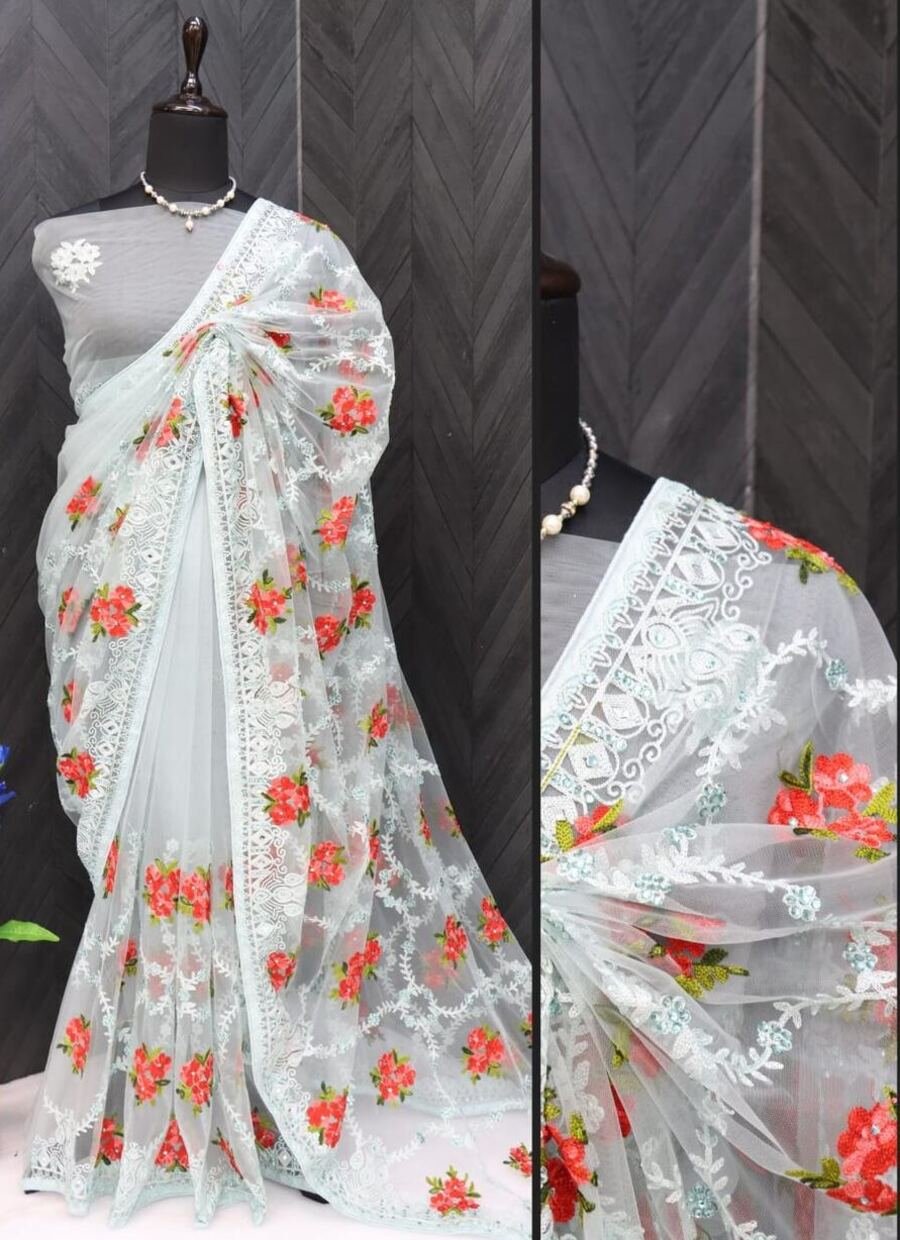 DESIGNER BUTTERFLY NET THREAD AND AARI EMBROIDERY WORK WITH STONE WORK SAREE WITH UNSTITCHED BLOUSE SKY