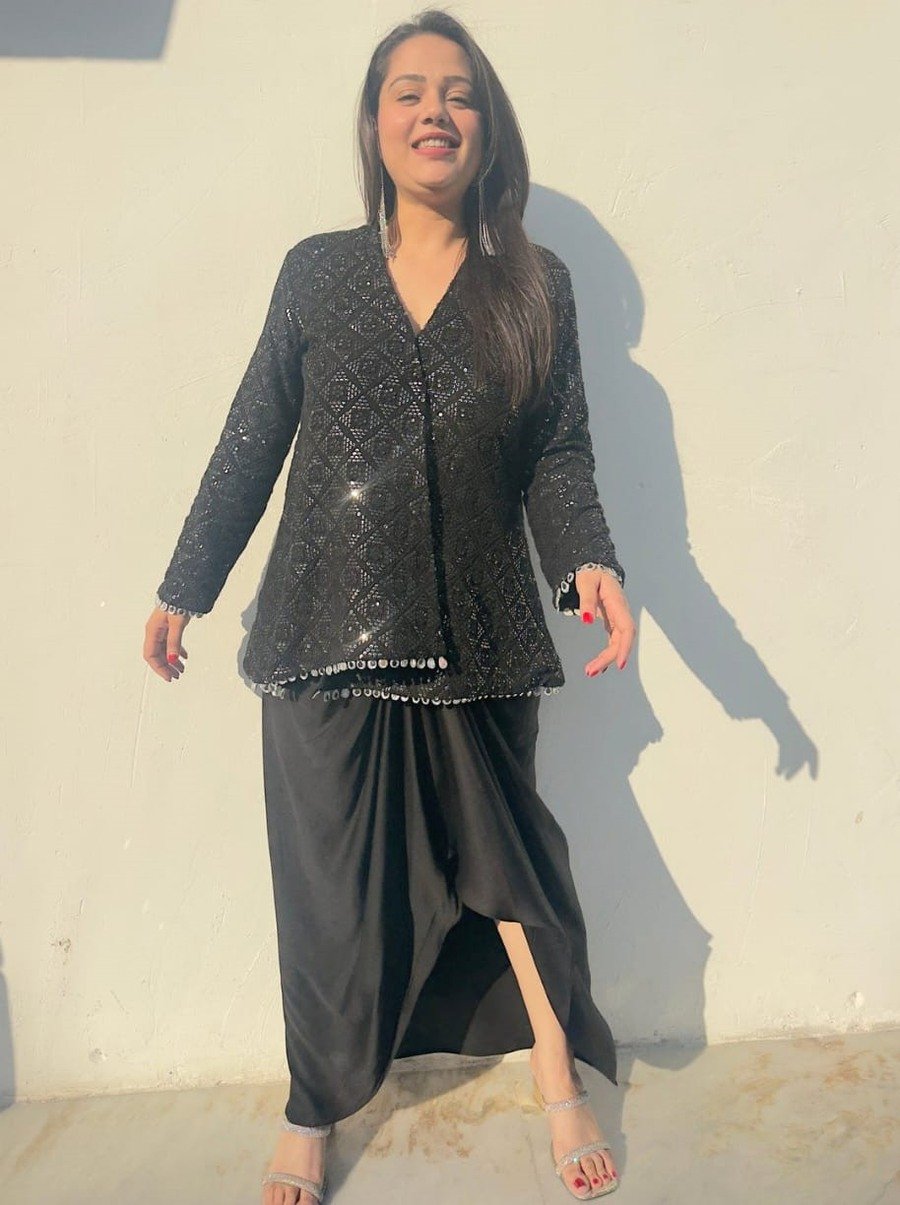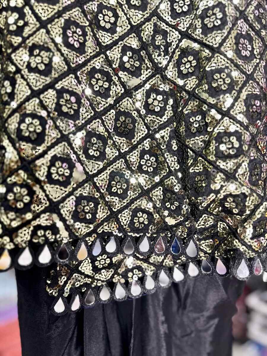 DESIGNER CHINON CREPE LINING AND ORIGINAL MIRROR LACE WORK TOP WITH DRAPE SKIRT BLACK