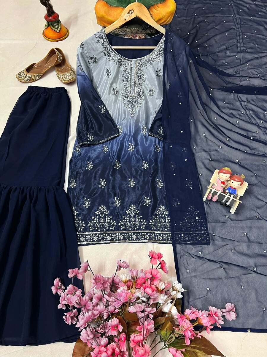 DESIGNER CHINON DIGITAL PRINT WITH ZARI EMBROIDERY SEQUENCE WITH STONE WORK TOP SHARARA WITH DUPATTA NAVY BLUE