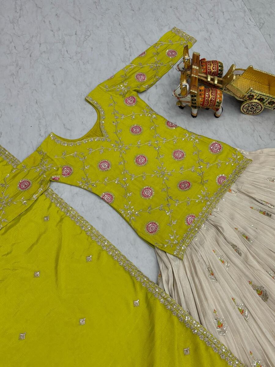 DESIGNER CHINON EMBROIDERY CODING SEQUENCE AND THREAD WORK TOP LEHENGA WITH DUPATTA PARROT GREEN