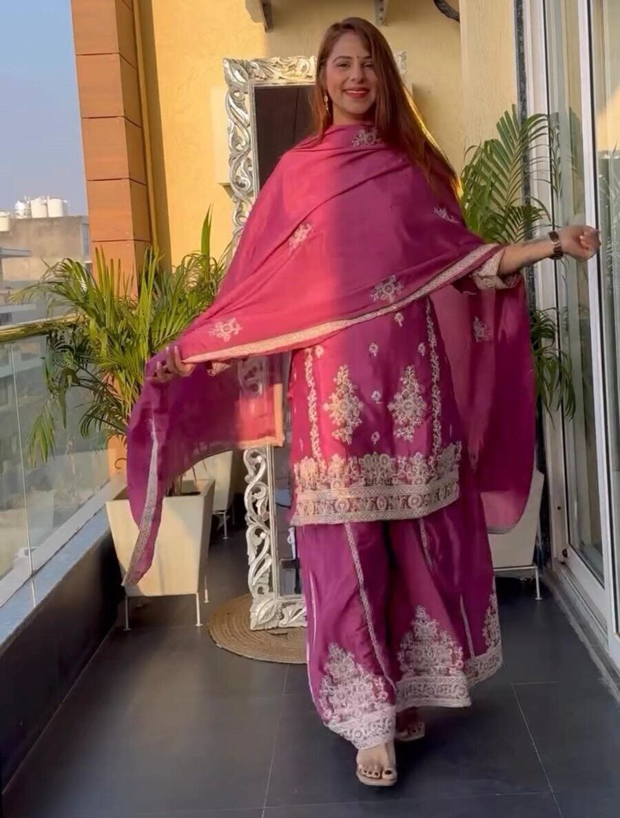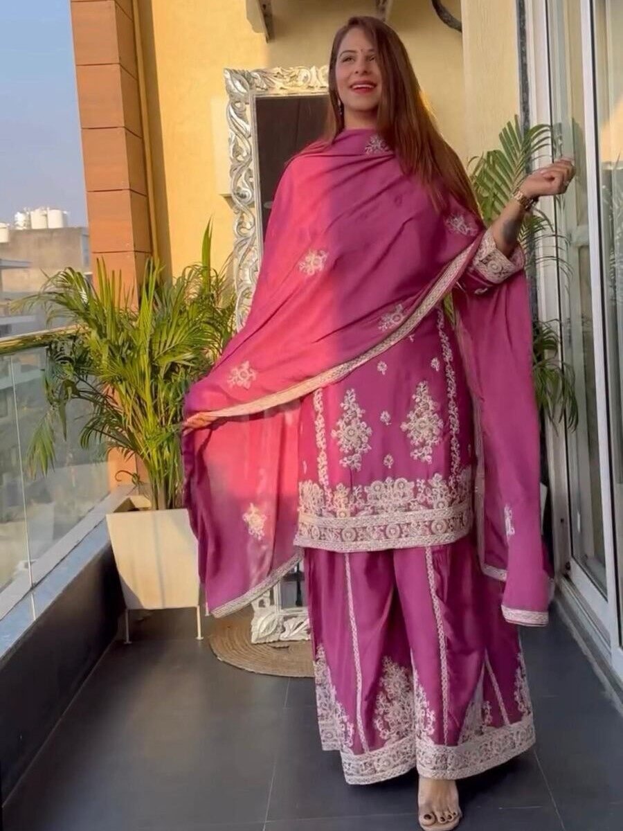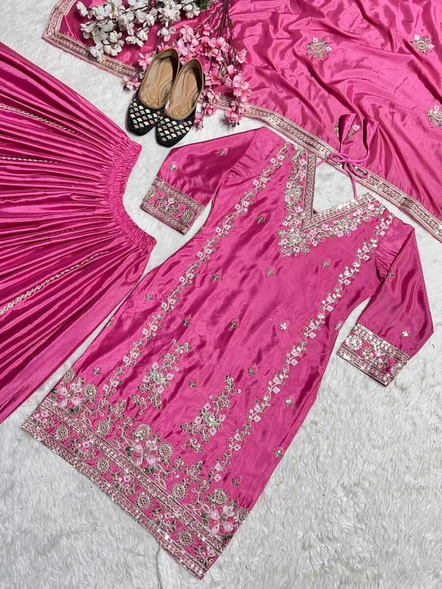 DESIGNER CHINON EMBROIDERY CODING SEQUENCE WORK TOP PALAZZO WITH DUPATTA PINK