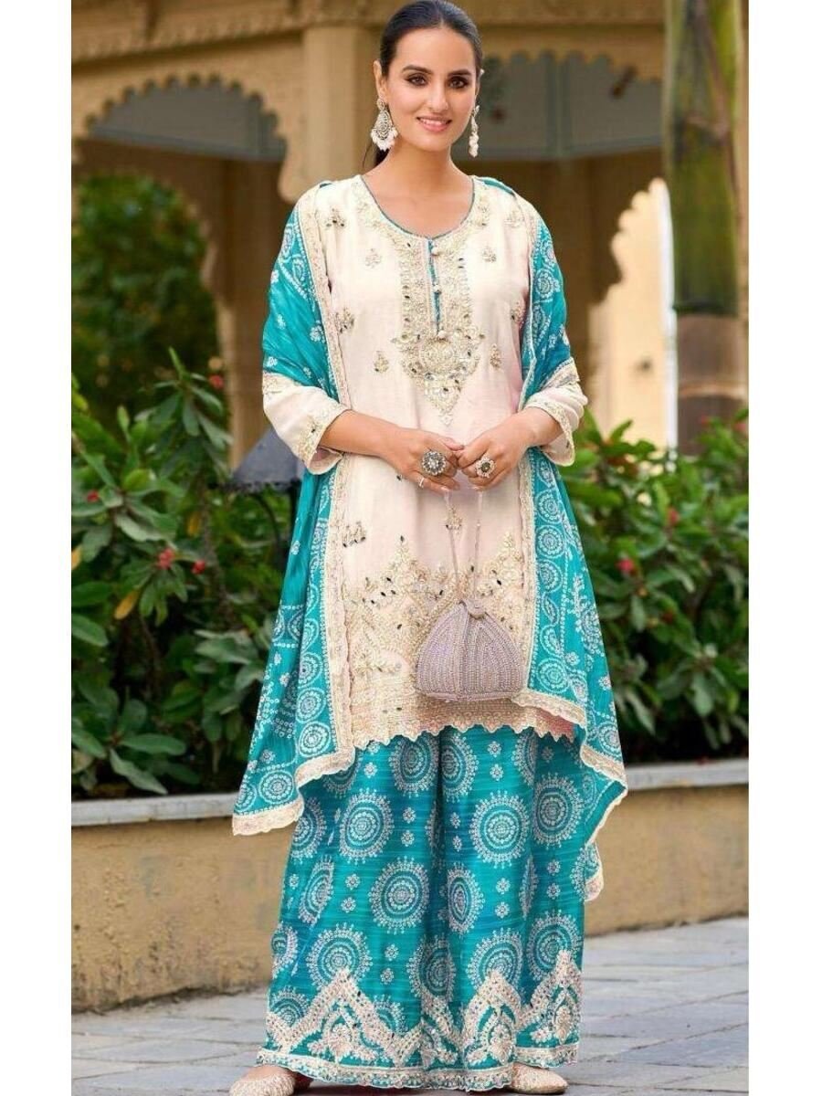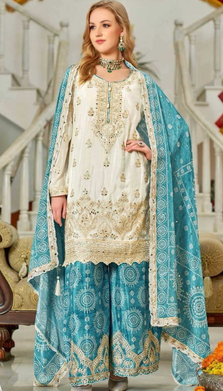 DESIGNER CHINON EMBROIDERY SEQUENCE CODING MIRROR HAND WORK TOP PALAZZO WITH DUPATTA