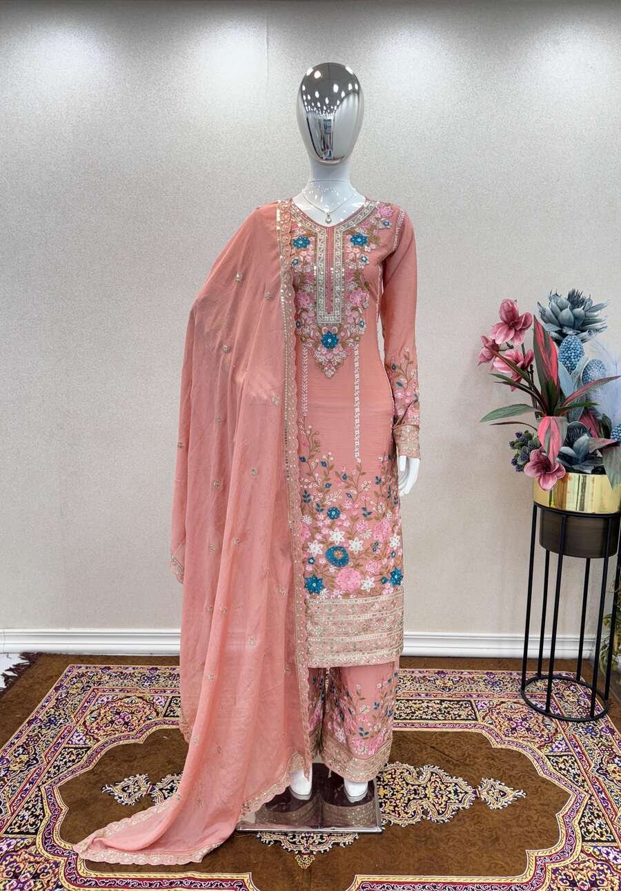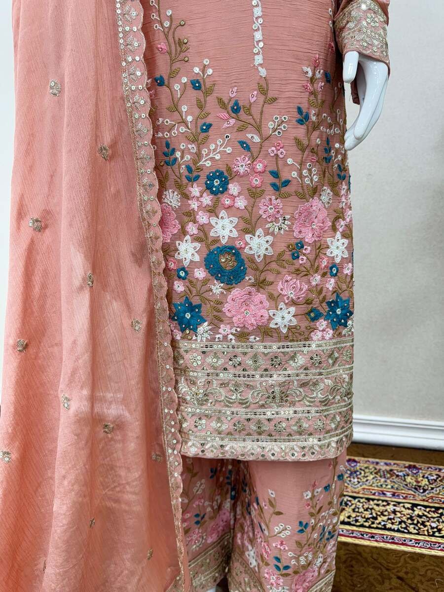 DESIGNER CHINON EMBROIDERY SEQUENCE DAIMOND HAND WORK TOP PALAZZO WITH DUPATTA PEACH