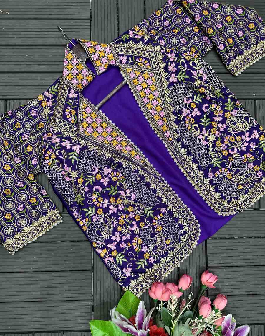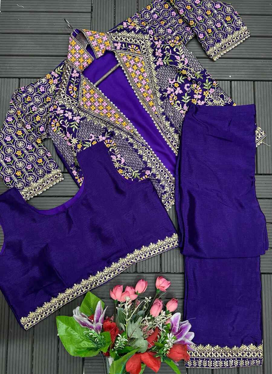 DESIGNER CHINON EMBROIDERY SEQUENCE WORK BLOUSE PALAZZO WITH KOTI PURPLE