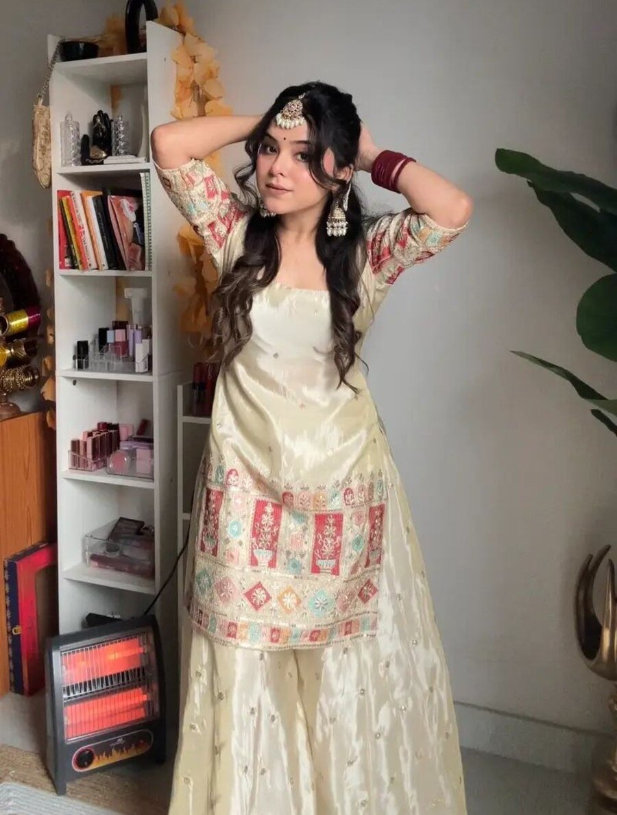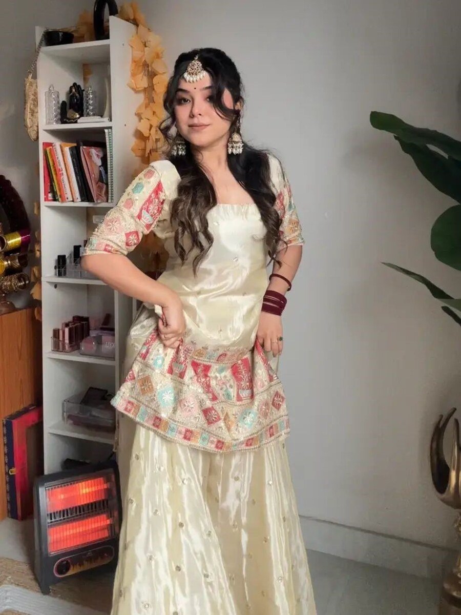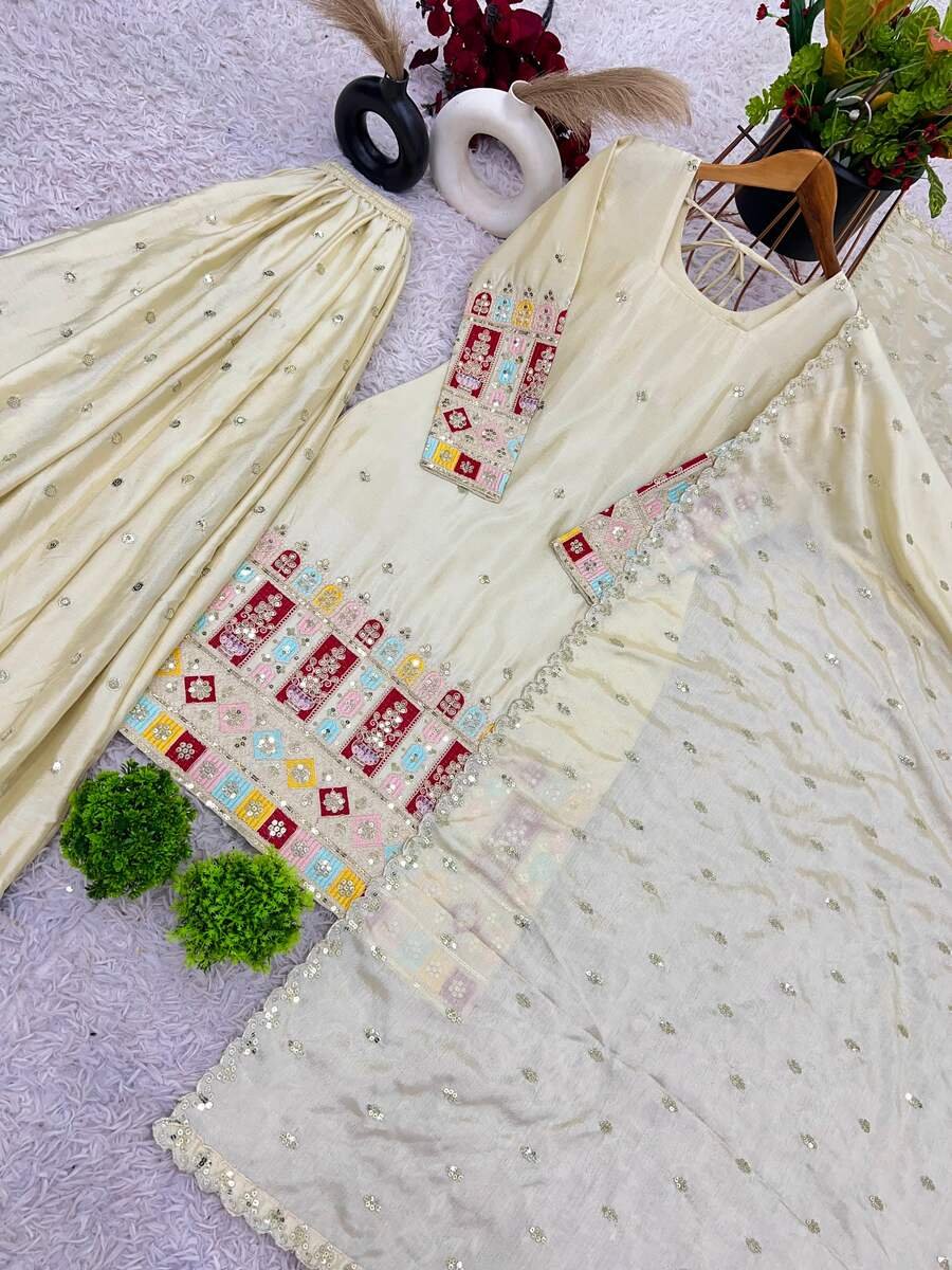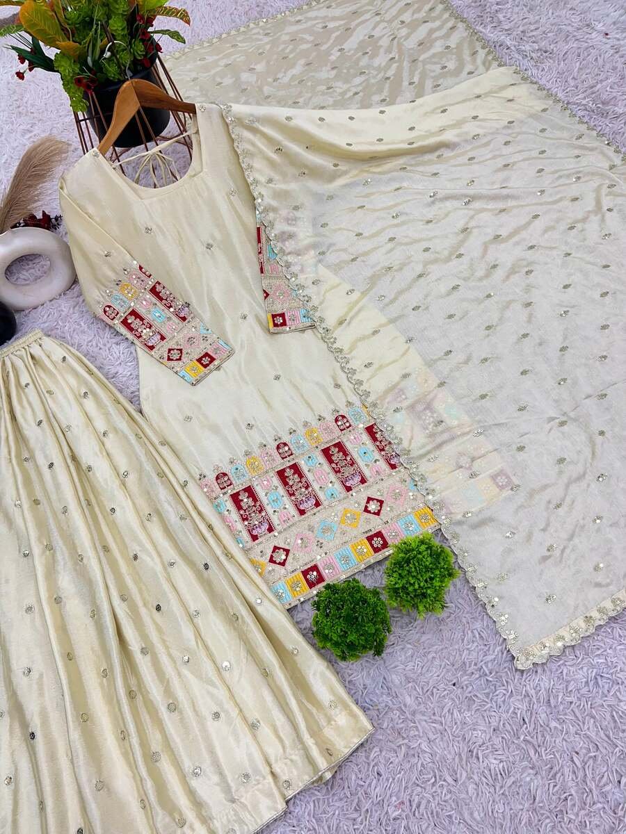 DESIGNER CHINON EMBROIDERY SEQUENCE WORK TOP GHARARA WITH DUPATTA WHITE