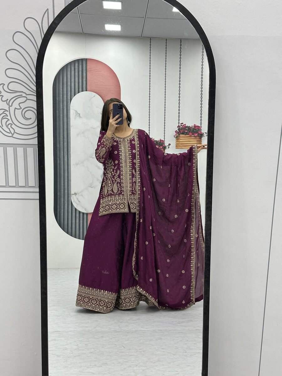 DESIGNER CHINON EMBROIDERY THREAD SEQUENCE WORK TOP PALAZZO WITH DUPATTA WINE