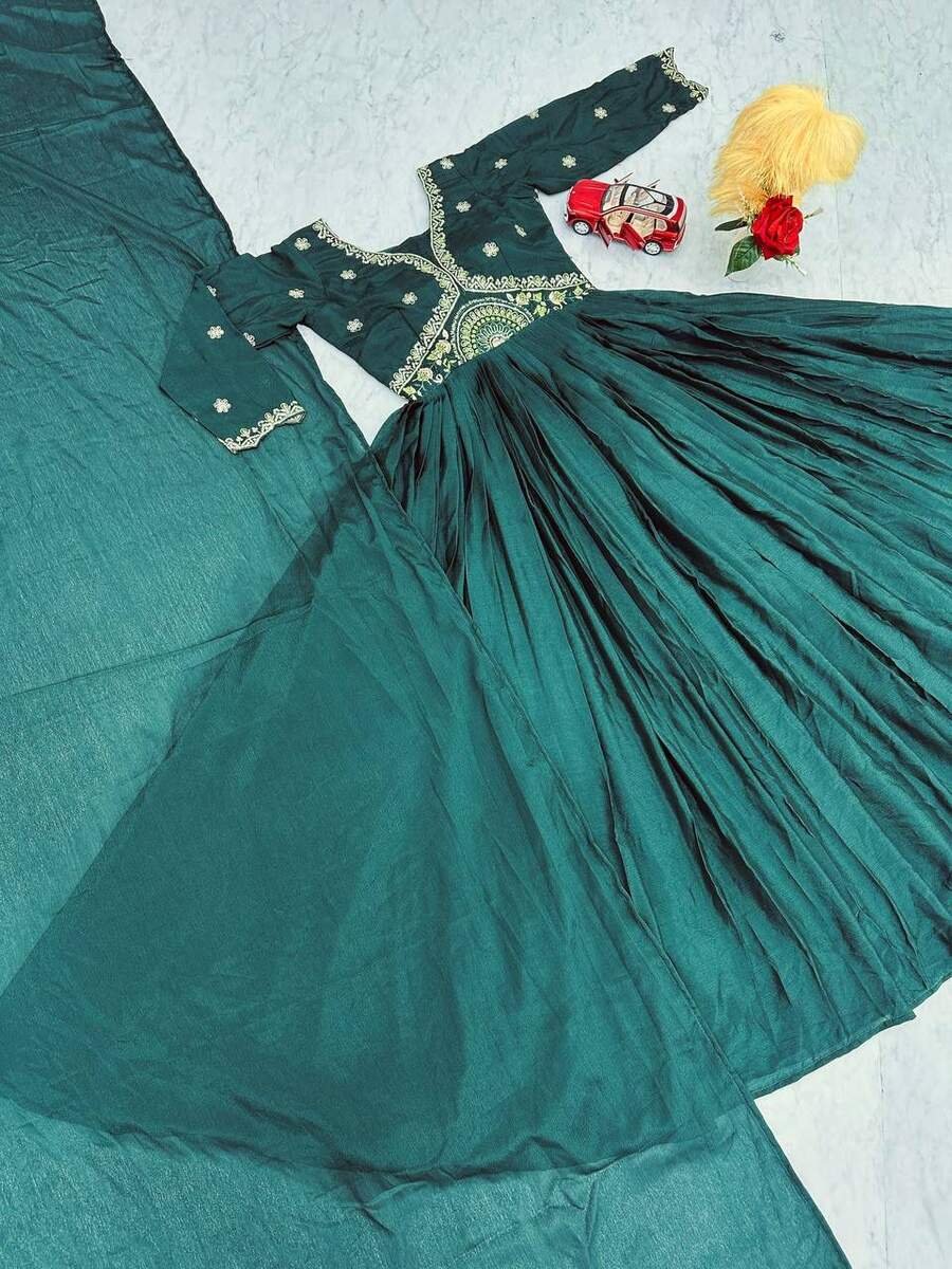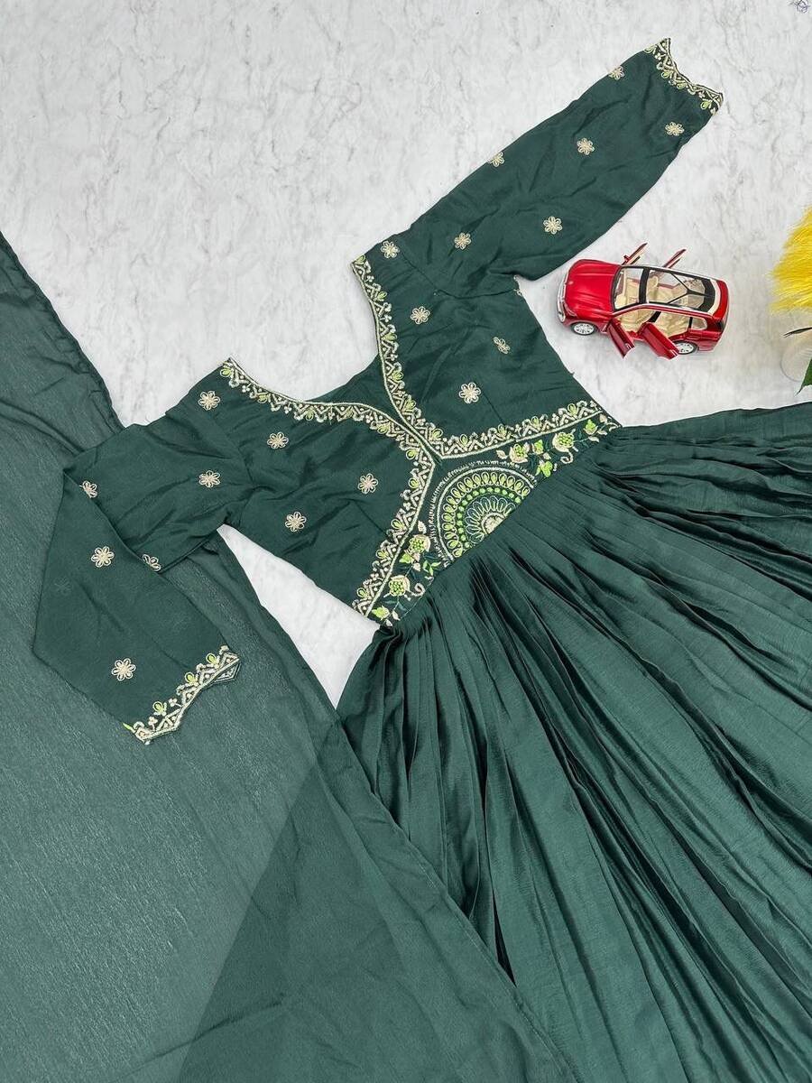 DESIGNER CHINON EMBROIDERY THREAD WORK GOWN WITH DUPATTA GREEN