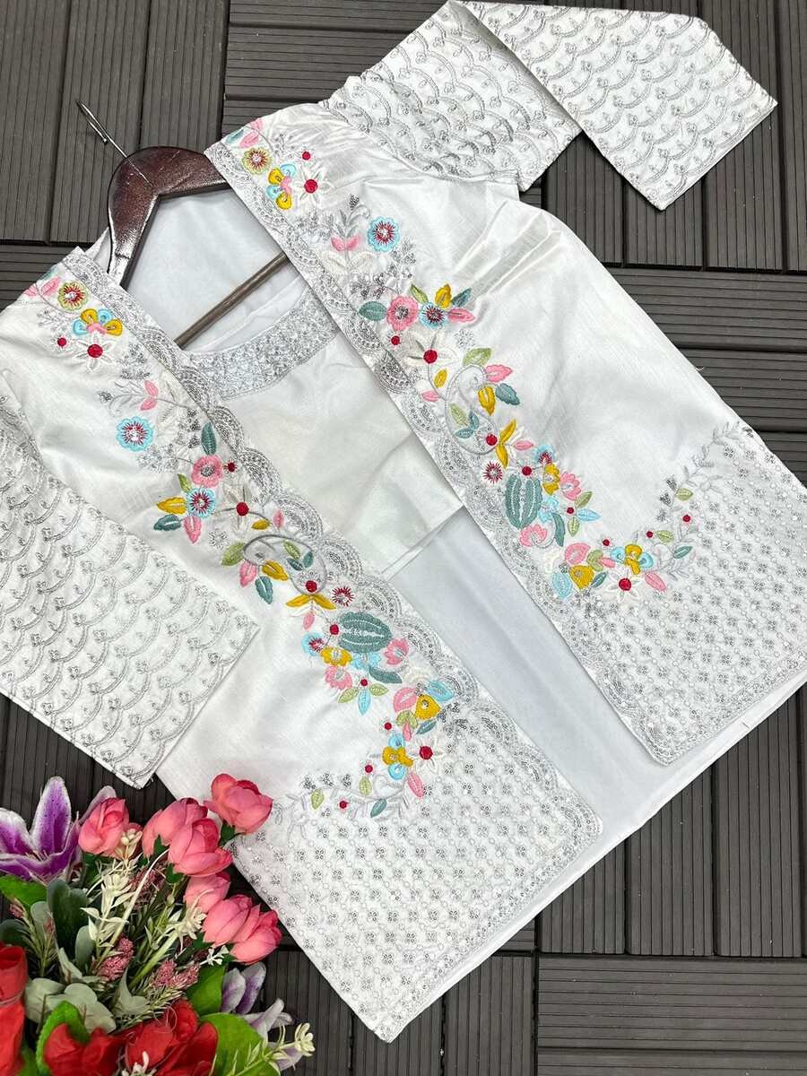 DESIGNER CHINON EMBROIDERY WORK DRAPE SKIRT WITH ATTACHED DUPATTA AND STITCHED BLOUSE AND KOTI WHITE